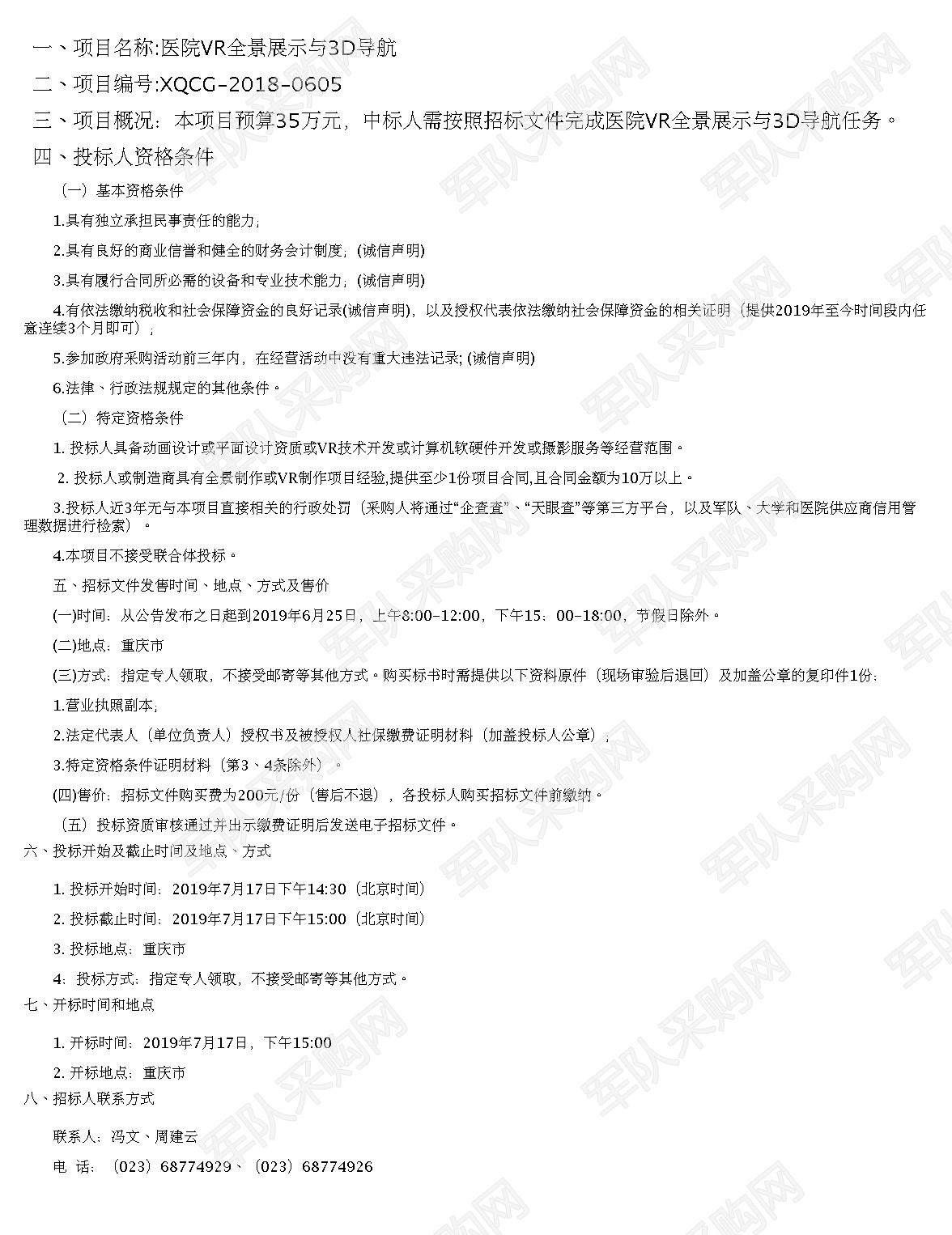 转自军队采购网采购公告—医院VR全景展示与3D导航
