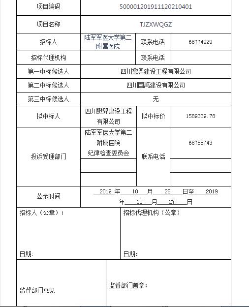 陆军军医大学第二附属医院中标候选人公示-TJZXWQGZ的中标候选人公示