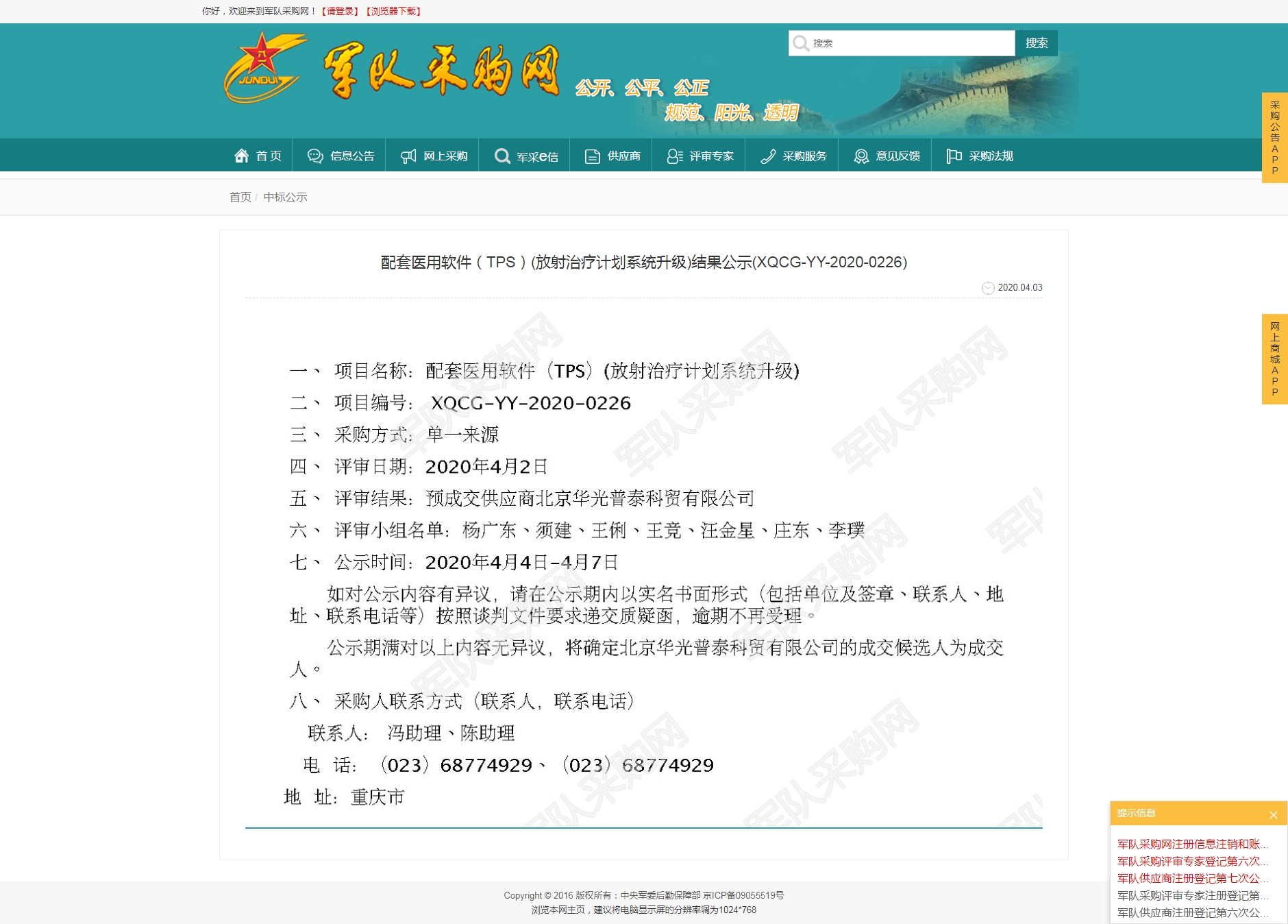 配套医用软件(TPS)(放射治疗计划系统升级)结果公示