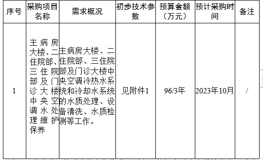 中央空调水处理维护保养项目采购意向公开 为便于供应商及时了解军队采购信息,将本项目采购意向公开如下,欢迎供应商反馈意见建议。 一、项目名称:主病房大楼、二住院部、三住院部及门诊大楼中央空调水处理维护保养 二、项目概况: