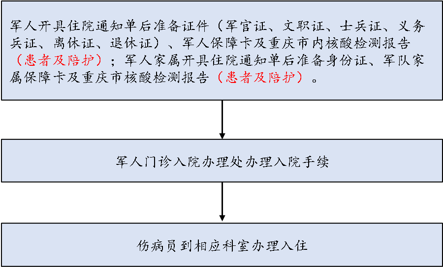 需携带证件(军官证、文职证、士兵证、义务兵证、退休证)、军人保障卡及重庆市核酸检测报告。