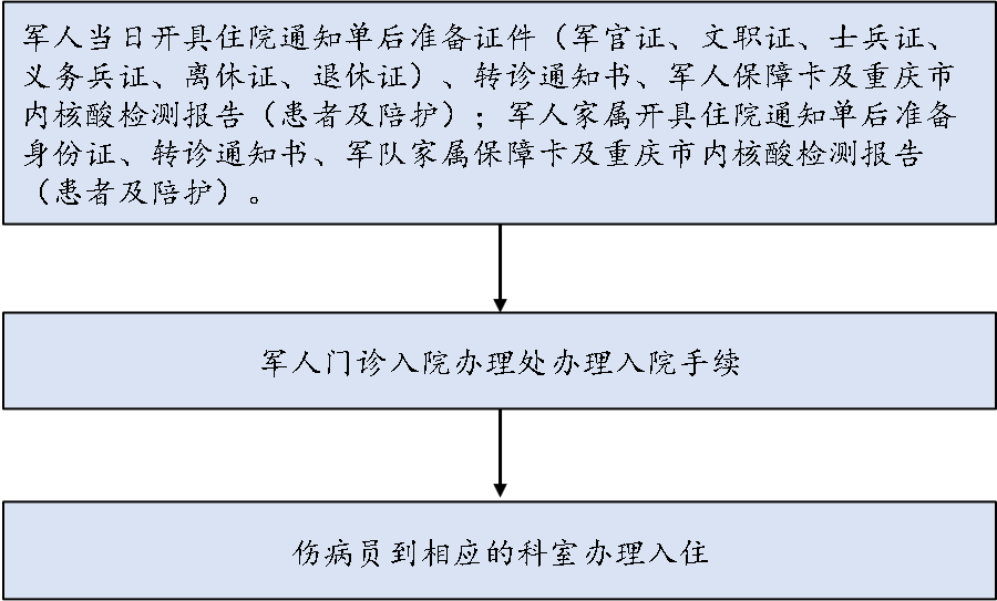 需携带在军队医院转诊信息平台的转诊通知书、证件(军官证、文职证、士兵证、义务兵证、退休证)、军人保障卡及重庆市核酸检测报告。