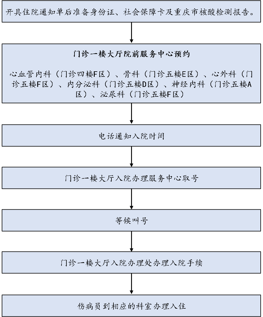 1. 需携带身份证或户口本、社会保障卡、住院证、预交金及重庆市内核酸检测报告(患者及陪护)。