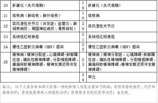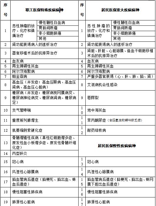 目前全市的职工医保特殊疾病病种、居民医保重大疾病及慢性病病种如下: