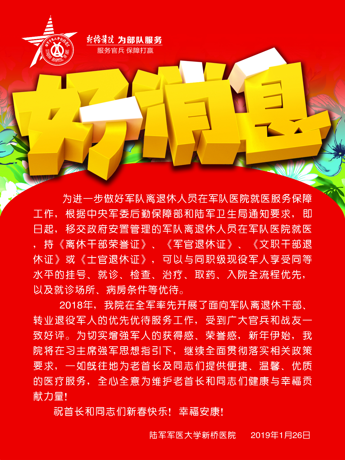 为进一步做好军队离退休人员在军队医院就医服务保障工作,自2019年2月1日起,移交政府安置管理的军队离退休人员在军队医院就医,持《离休干部荣誉证》、《军官退休证》、《文职干部退休证》、《士官退休证》,可以与同职级现役军人享受同等水平的挂号、就诊、检查、治疗、取药、入院全流程优先,以及就诊场所、病房条件等优待。