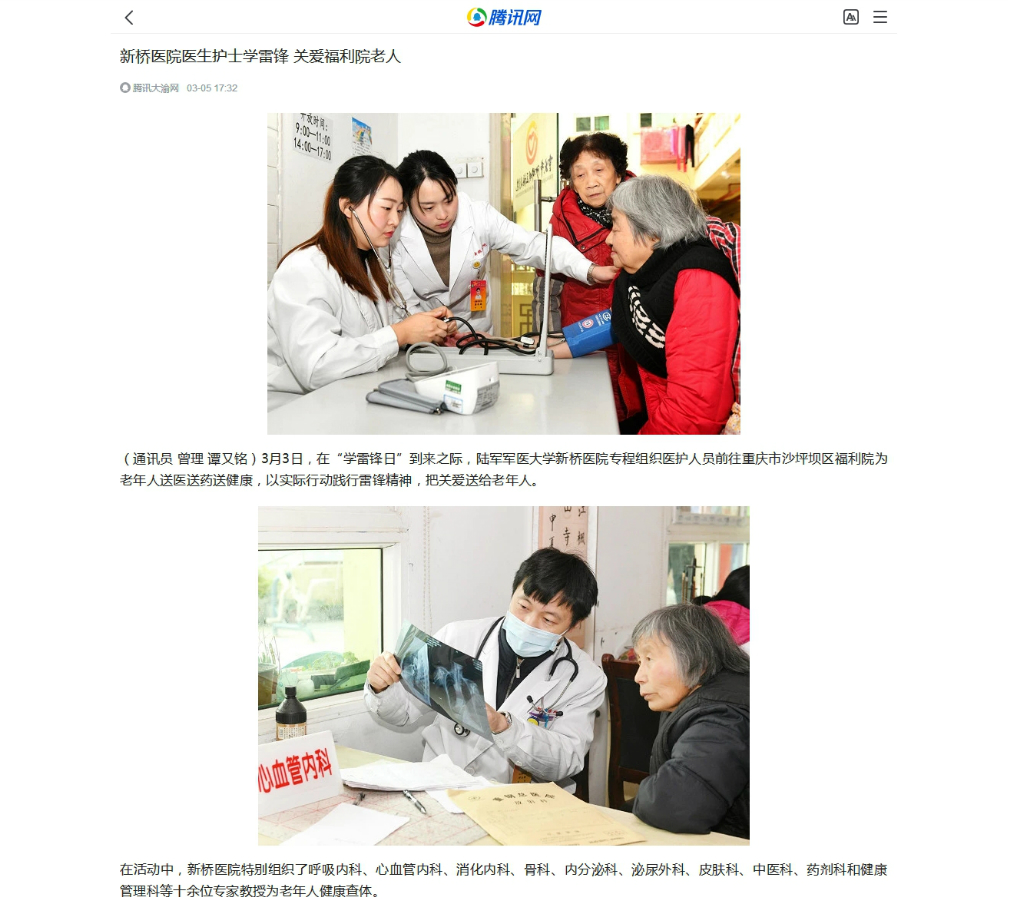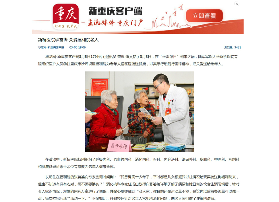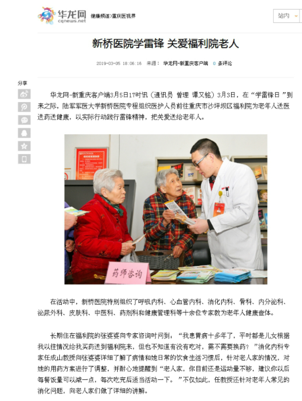 近日,各大媒体报道陆军军医大学新桥医院学雷锋活动情况