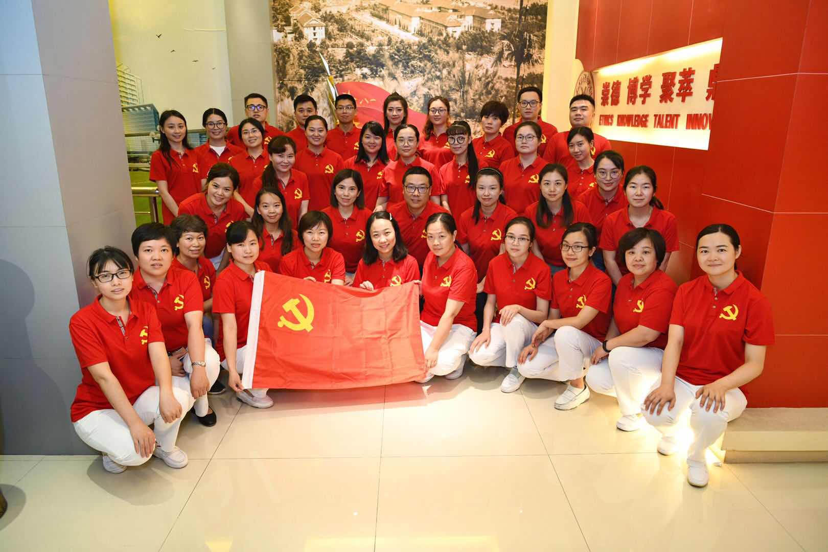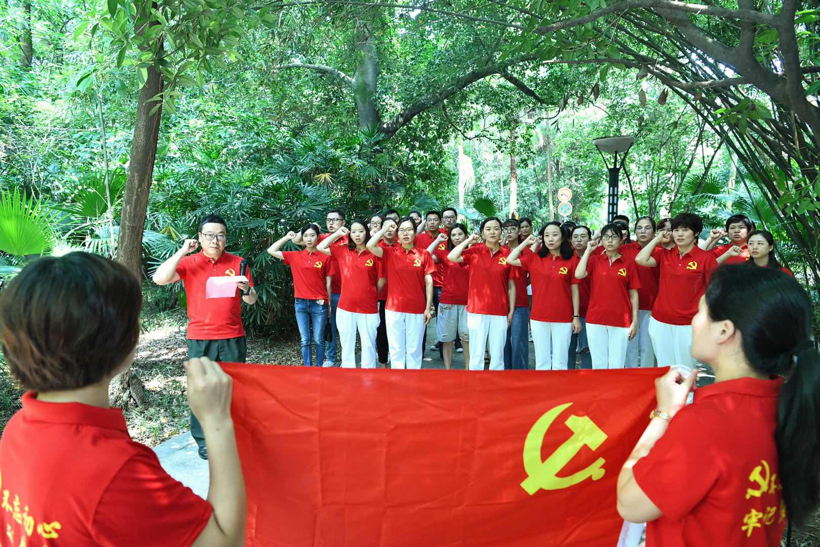 在活动中,全体人员身着统一定制文化衫,金色的党徽映衬在每个人左胸,背心印刻有党徽和“不忘初心,牢记使命”八个大字,将活动主题牢牢铭刻在每个人心中。