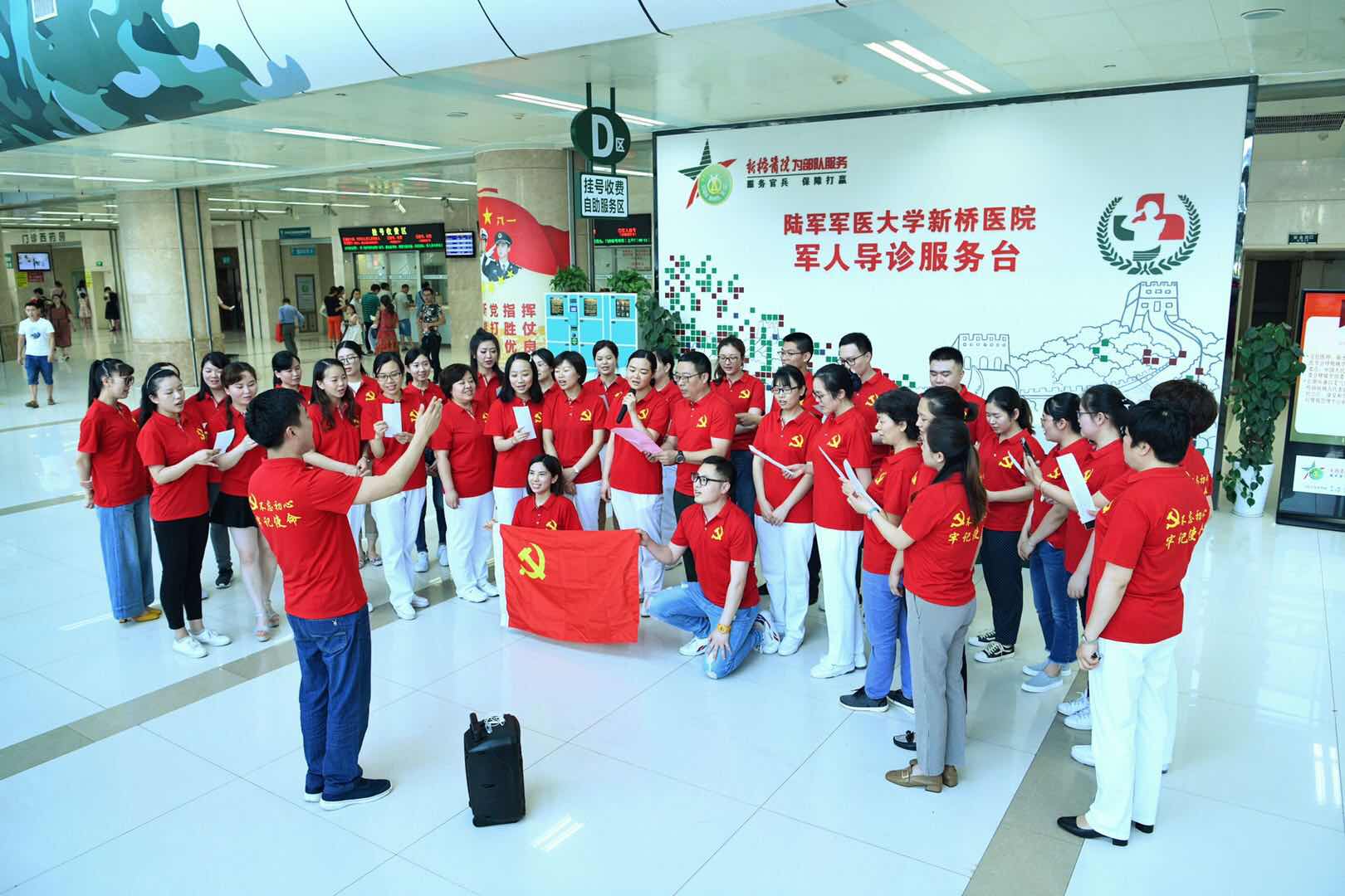 在“献歌祖国,致敬党建”快闪活动中,大家同时闪现医院门诊大厅,随着音乐旋律响起,大家高声唱响《我和我的祖国》,“我和我的祖国一刻也不能分割……我的祖国和我像海和浪花一朵,浪是海的赤子海是那浪的依托……”主旋律萦绕在门诊大厅,感染到每一个人。