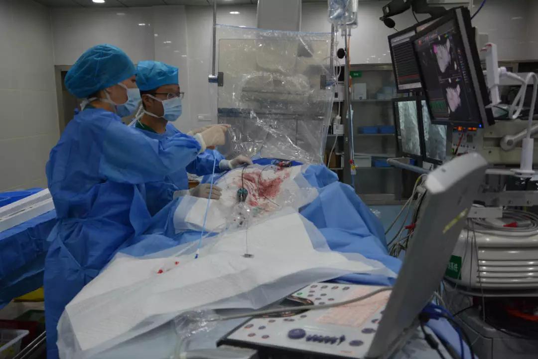 在心血管内科黄岚教授及晋军主任的指挥下,由谭虎副主任、张波主任医师、张邑副主任医师及宋元彬主治医师组成的手术团队密切配合下,借助国际最新的SoundStar心腔内三维超声系统进行手术,术中发现患者左房明显增大,同时伴有肺静脉畸形,给射频消融带来了极大的难度,但最后大家克服了重重困难,顺利完成了房颤射频消融术。随后,又在SoundStar心腔内三维超声系统精准定位下,对导致梗阻的室间隔部位进行消融。成功消融后的心腔内压力检测显示患者的左心室出道压力阶差(代表左心室流出道梗阻程度的指标)明显下降。