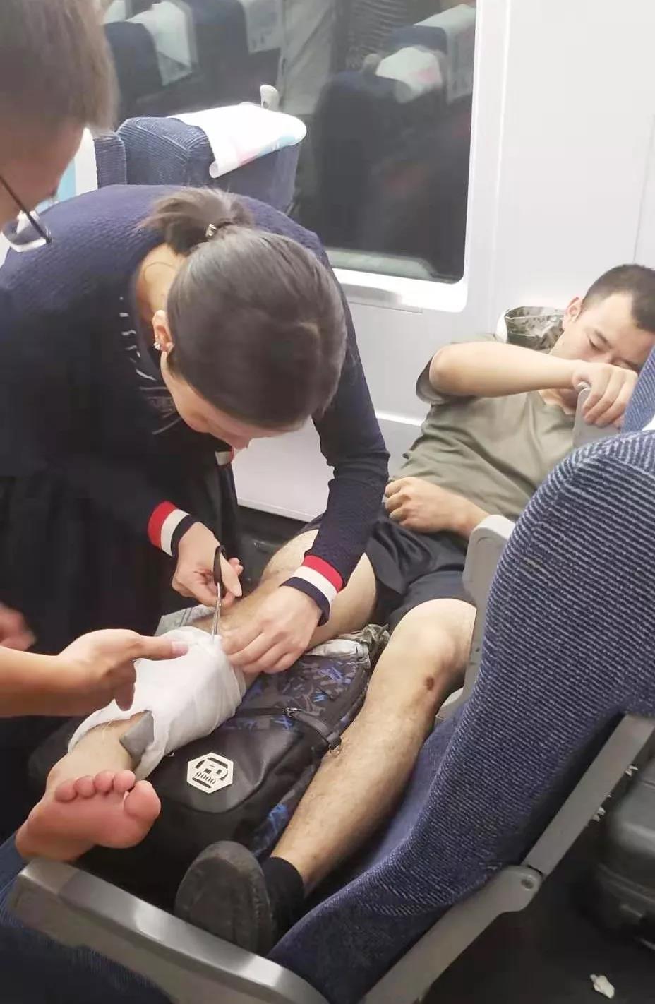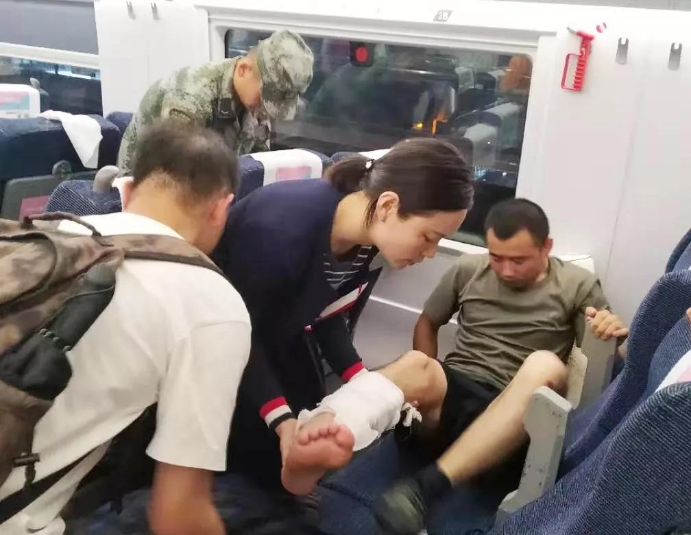 由于列车位置已满,与周畅护士长同行的3名护士主动起身给受伤战士腾出“临时床位”,并与护士长、陪同战士一起将其挪到座椅上,平放、垫高受伤的右腿,从列车工作人员那里拿来剪刀,将原先包扎固定的纱布剪掉,重新进行固定包扎。经过抬高、减压、制动、重新包扎等处理后,受伤战士连说“现在没那么痛了”。