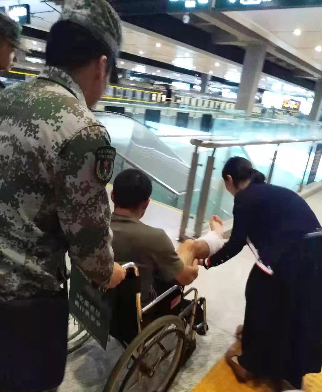 时间回到6月22日晚上9时过,来自某部队的任亮战士因右腿骨折,在战友的陪同下,坐动车从内江到重庆求医。在车上,坐在轮椅上的任亮不管怎么摆放受伤的右腿,腿部都会因为动车的晃动而疼痛难忍,剧烈的疼痛让他忍不住大声呻吟。