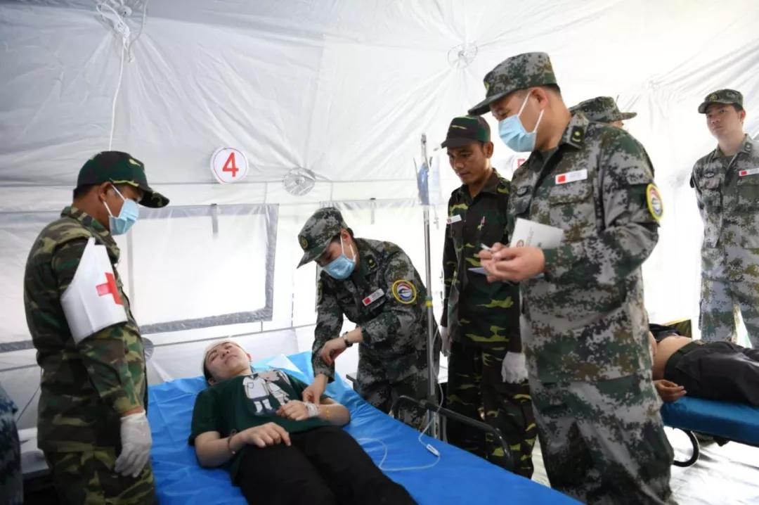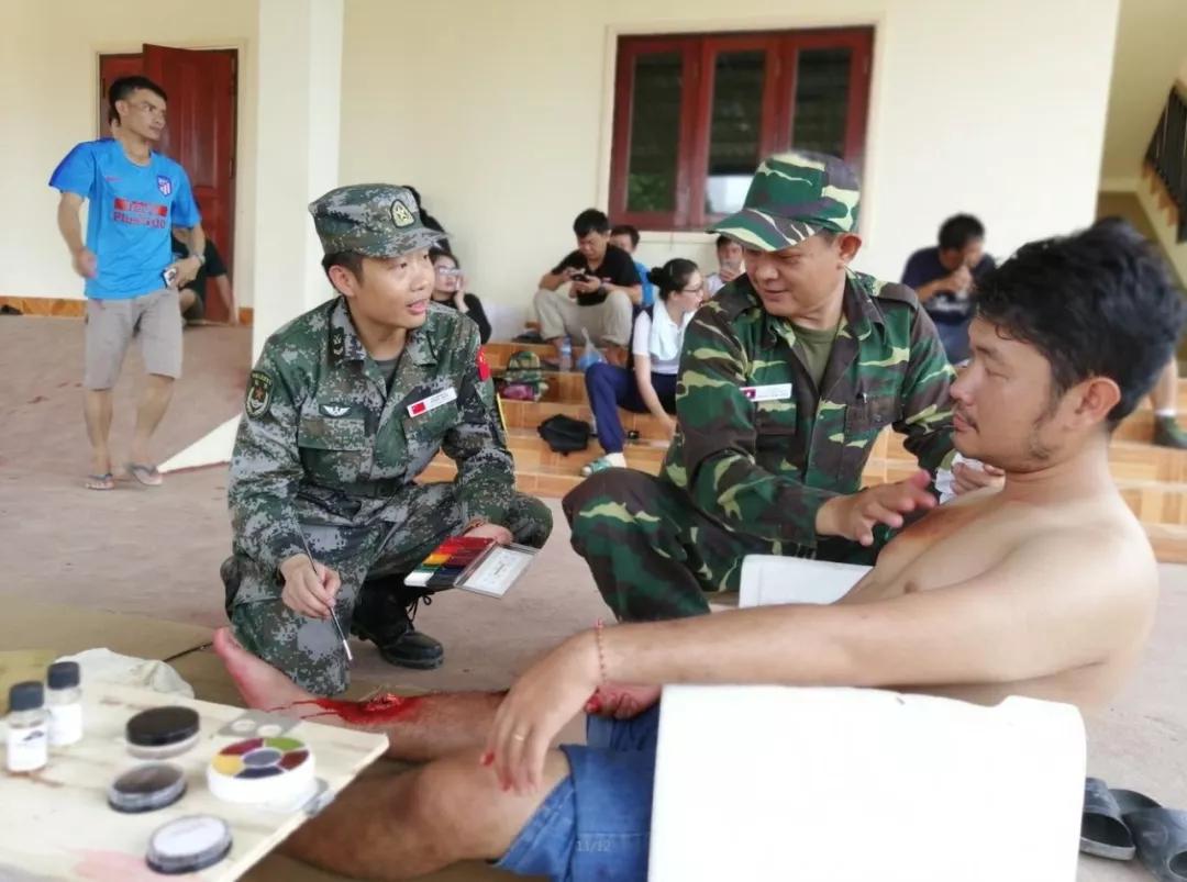 让老方参演队员熟悉掌握帐篷医院先进的医疗卫生设备,也是“和平列车”医疗队共同的愿望。此次联演,双方参演官兵近500名,各组室参演队员由中老双方共同组成。在分类后送组,老方队员亚瑟在组长刘勇的指导下,熟练地使用着检伤分类包;在收容救治组,医生闫晶晶手把手教老方队员做喉镜检查;在化妆组,队员王莘文和胡波向老方队员详细讲解伤员化妆要领;在医技保障组,老方队员马克向医生杨国良竖起大拇指说:你教得太好了,我学到了很多。