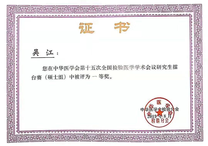 近日,在第十五次全国检验医学学术会议中,陆军军医大学新桥医院检验医学中心硕士研究生吴江(导师:李忠俊)成功入围研究生擂台赛决赛(硕士组),通过激烈紧张的现场角逐,最终凭借在读期间的创新性的研究成果“LncRNA-TUG1/Smad5抑制放射后骨髓间充质干细胞成骨分化的作用机制(Theranostics. 2019 Apr 12;9(8):2198-2208.封面文章,IF=8.537)”,赢得了评委、参会嘉宾的高度好评与认可,以高分获得硕士组一等奖。