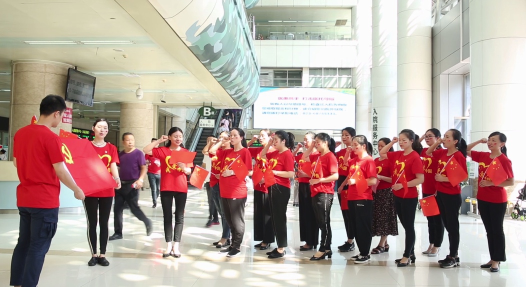 上午10:00我科部分工作人员在门诊一楼重温入党誓词,时刻谨记作为一名党员的使命。接着,集体合唱“大中国”,表达大家对祖国母亲的热爱。
