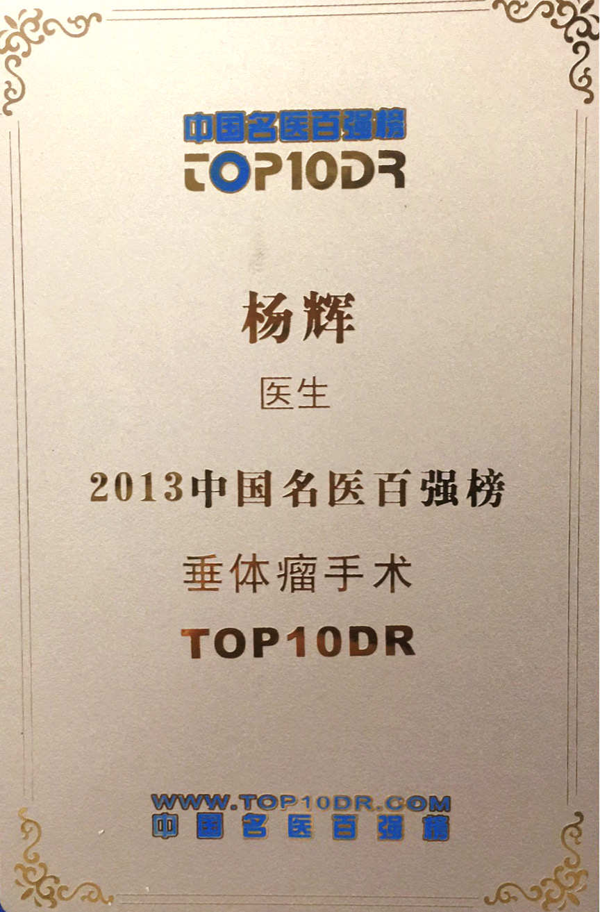 他还以第一完成人获得军队医疗成果一等奖、重庆市科技进步一等奖等省部级奖项6项。发表论文150余篇,其中以第一及通讯作者在国外知名SCI杂志发表论文65篇。他还获国家“求是奖”、“国家新世纪百千万工程人才”、“全军创新人才工程领军人才”、“军队院校育才银奖”、重庆市“优秀博士生导师”等荣誉称号,是重庆市首席专家工作室特聘教授、国务院特殊津贴获得者。2013年至今杨辉教授连续多次获评中国垂体瘤手术全国前十强。