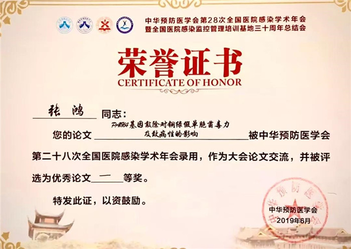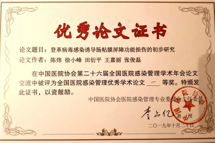 日前,中国医院协会第26届全国医院感染管理学术年会在山东泰安隆重召开,在此次学术大会上,来自陆军军医大学新桥医院感染控制科陈炜主任牵头撰写的学术论文《登革病毒感染诱导肠粘膜屏障功能损伤的初步研究》入选优秀论文进行大会交流,并获评为全国医院感染管理优秀学术论文一等奖。此前,该科张鸿主治医师牵头撰写的学术论文《PA1864基因敲除对铜绿假单胞菌毒力及致病性的影响》获评中华预防医学会第28次全国医院感染学术年会上也获评优秀学术论文一等奖。新桥医院感染控制科在今年两大全国年会上荣获两项一等奖、一项三等奖和一项优秀奖的优异成绩。