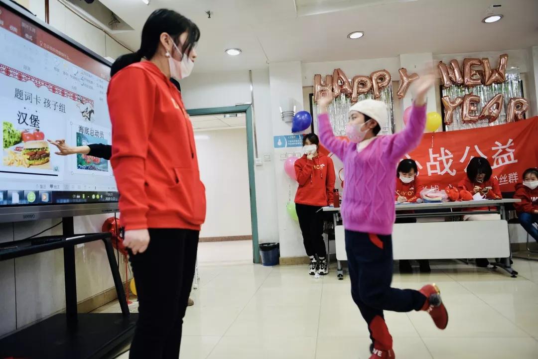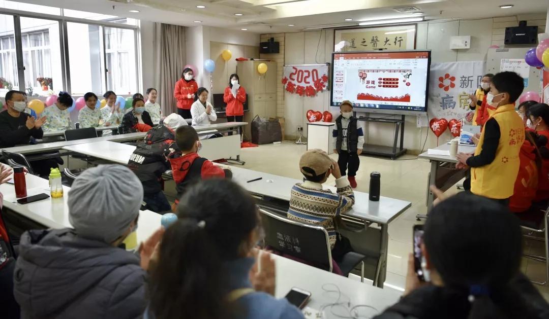 在“病房学校”开学以来,与孩子们相处近半年的志愿者们也精心准备了陶笛独奏、手语舞《感恩的心》等节目一起与孩子们分享节日的喜悦。演出后,小朋友们还同医护人员和志愿者们做了夹玻璃珠、你做我猜等互动游戏,并给孩子们赠送了书包、文具、象棋、幼儿教具等新春礼品。陪伴孩子参加活动的家长们不是为精彩的节目鼓掌,还有的家长掏出手机打开视频直播与没能参加活动的家人一同分享孩子在“病房学校”的快乐。