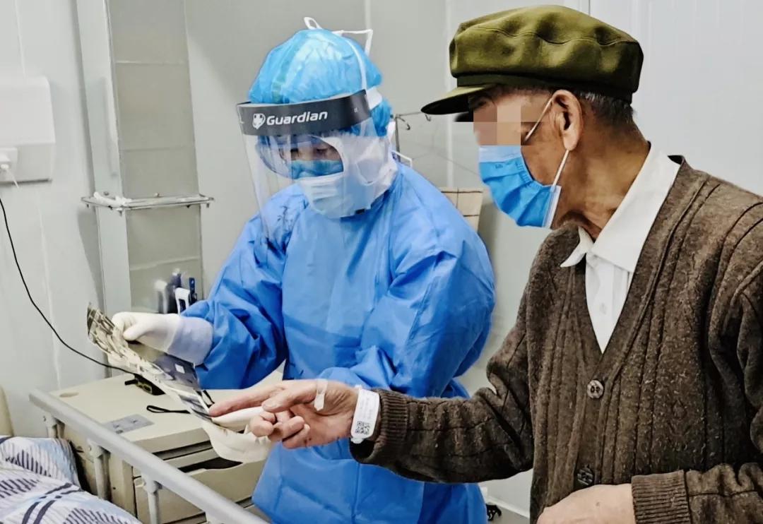在病房里,知道张爷爷不会使用遥控器点播数字电视,护士们会一点点把开关键、功能键、音量键、频道键一个个指给老人家看,教会老人家使用遥控器点播电视选台。知道杨奶奶此前眼睛长倒睫毛,眼睛总感觉睫毛扎眼睛不舒服,护士们都会隔着防护镜、面屏仔细帮杨奶奶检查眼睫毛,然后再贴着耳朵给杨奶奶反复讲眼睛不舒服的缘由。