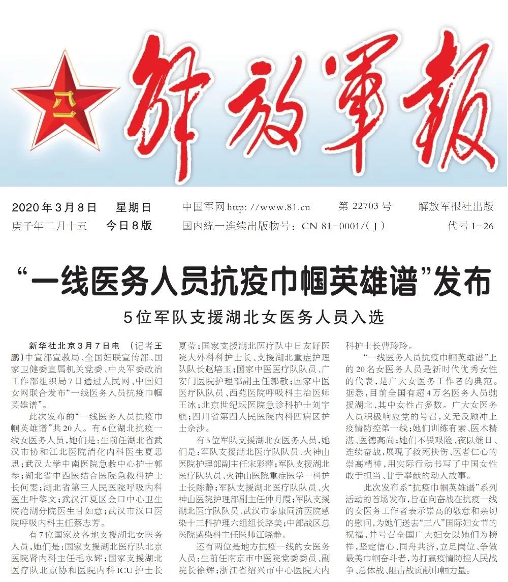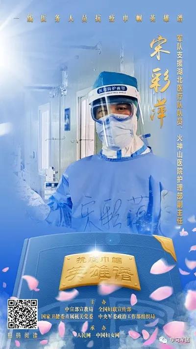 中宣部宣教局、全国妇联宣传部、国家卫健委直属机关党委、中央军委政治工作部组织局3月7日通过人民网、中国妇女网联合发布“一线医务人员抗疫巾帼英雄谱”。军队支援湖北医疗队队员、火神山医院护理部副主任宋彩萍光荣上榜。