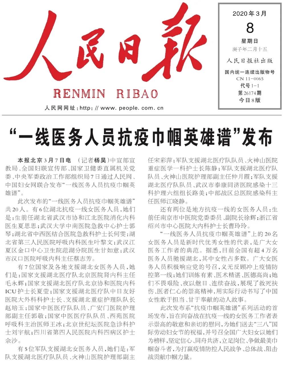 据了解,此次发布的“一线医务人员抗疫巾帼英雄谱”共20人。有6位湖北抗疫一线女医务人员,7位国家及各地支援湖北女医务人员和5位军队支援湖北女医务人员,以及两位地方抗疫一线的女医务人员。