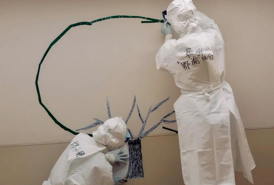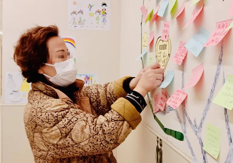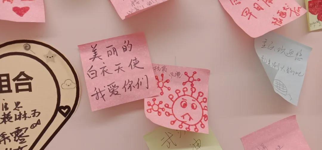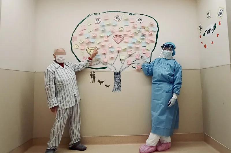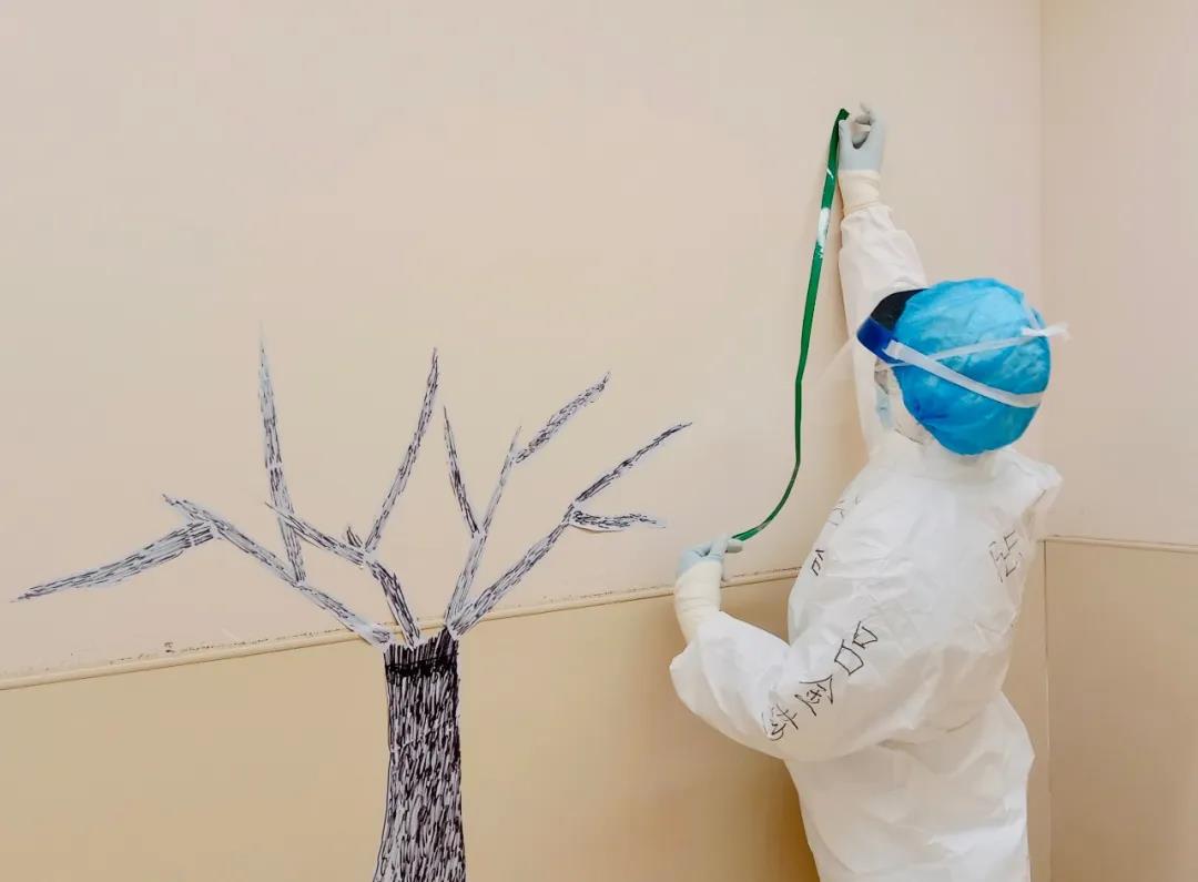 在隔离病区一面墙壁上“生长”了一颗褐色的树干,从最初光秃秃的枝干起,随着医务人员和患者的不断加入,在枝干上不断生长出一片片的绿色、蓝色、红色、黄色小“树叶”。在这里没有相同的两片树叶,每片“叶子”上面都有着不同的留言,大家路过时都会驻足赏析每片“叶子”的留言,要么就会拿起纸笔添上一片“树叶”:
