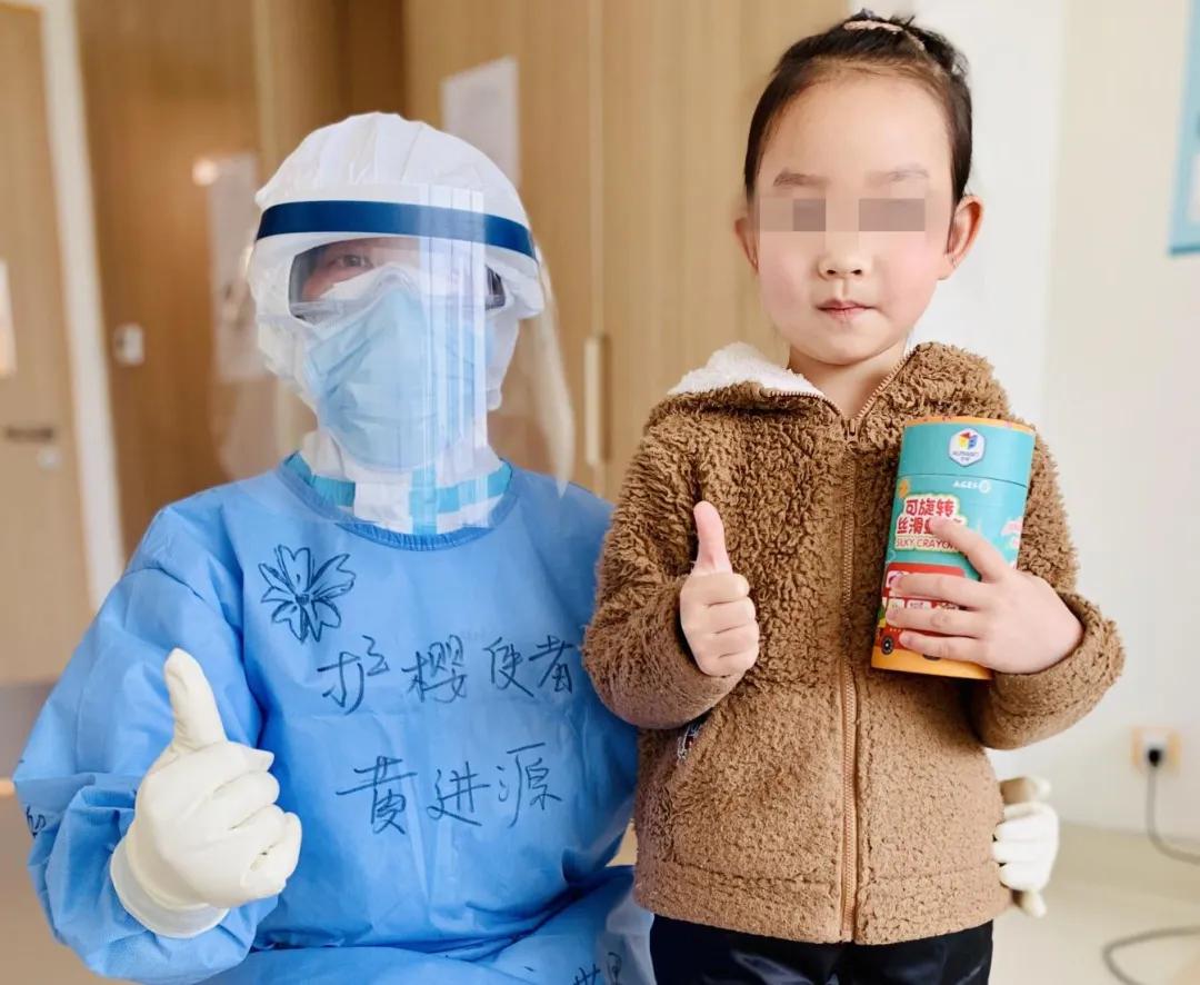 受学形象设计的妈妈影响,乐乐从小就是一个爱美的女孩,但在医院住院期间,乐乐最初看到穿防护服的护士姐姐还十分陌生害怕,会往妈妈身后躲避。看到乐乐表现出来的恐惧,黄进源与护士们也给了她更多的关心和关爱,时常到病房陪乐乐聊天,给乐乐送零食。特别是听说乐乐喜欢画画,她还专门托武汉的朋友帮忙,经多方找寻才买到一盒彩色蜡笔,专门给乐乐送到隔离病区。