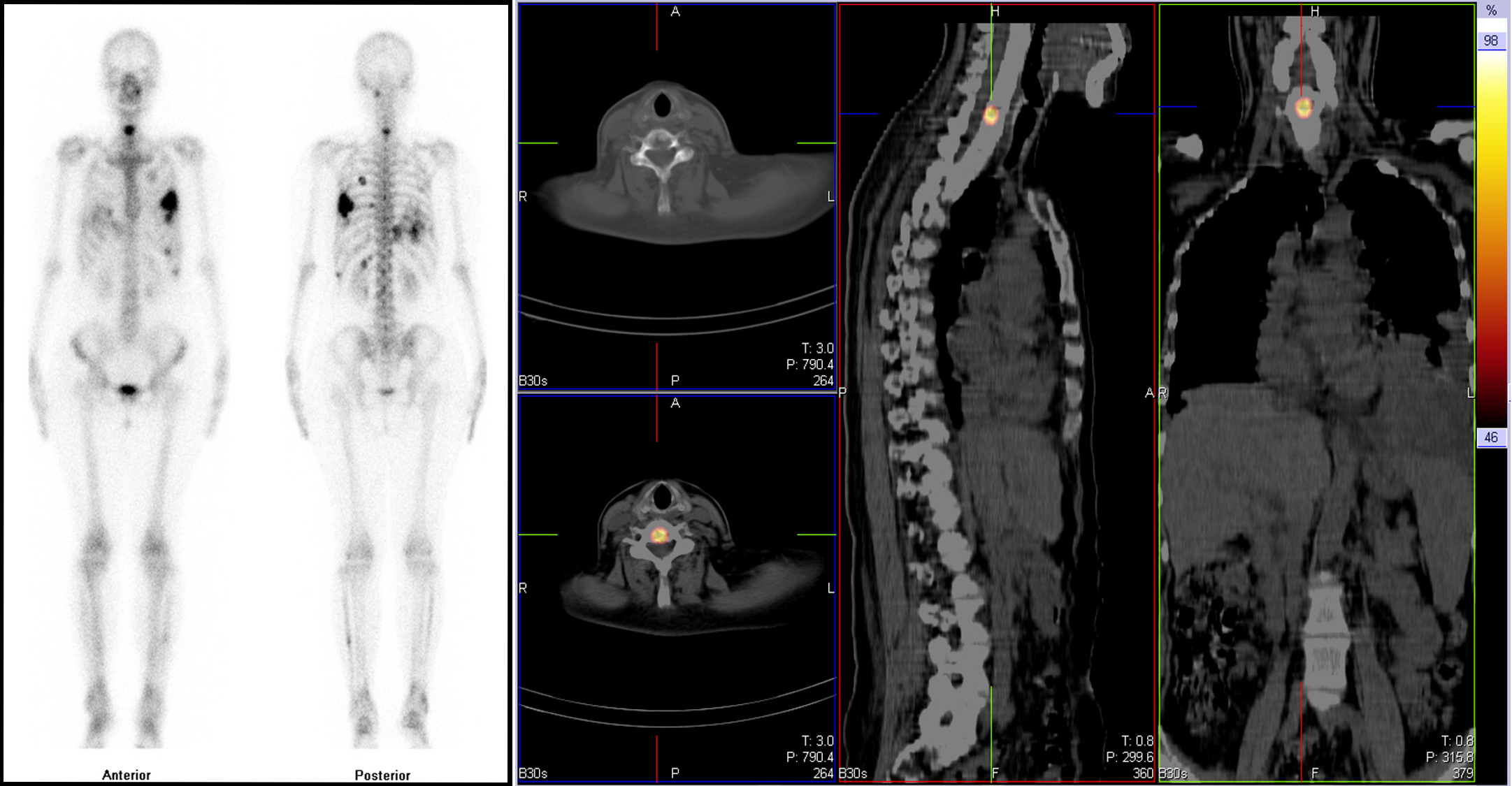 全身骨显像(左)结合体部SPECT/CT断层显像融合(右)显示颈6椎体骨质破坏