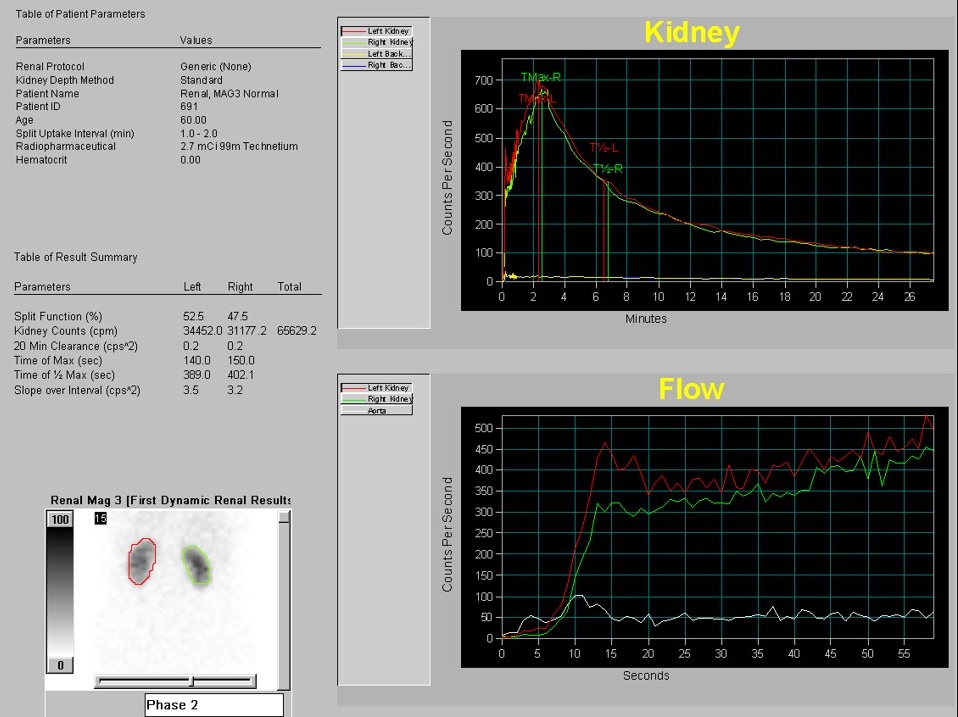 通过肾功能动态相、血流灌注相可分别评估左、右肾功能和测定肾小球滤过率
