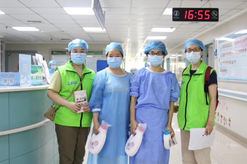 6月10日下午,载满了爱心洗衣液的小推车,被缓缓送进了血液病医学中心的病房。 两位山城志愿者和护士小姐姐们一起将这份礼物,送到正在治疗病区、洁净病区、康复病区、层流病房接受治疗的患儿或家属手中,同时叮嘱他们一定要注意清洁卫生,争取早日康复。