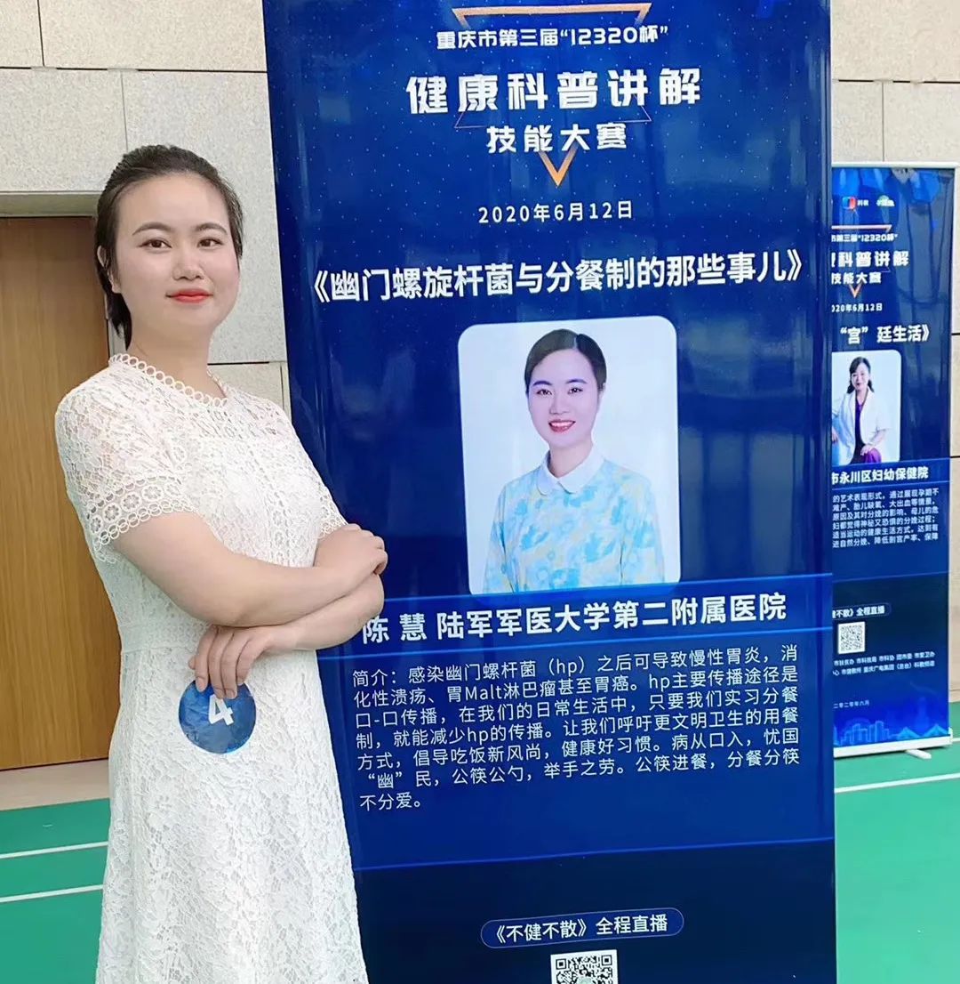比赛中,陈慧以新颖的视角,为大家带来了《幽门螺杆菌与分餐制的那些事儿》,通过对幽门螺杆菌广泛性,危害性的讲解,引出分餐制使用的必要性及如何使用,呼吁更文明卫生的用餐方式,倡导吃饭新风尚,健康好习惯。