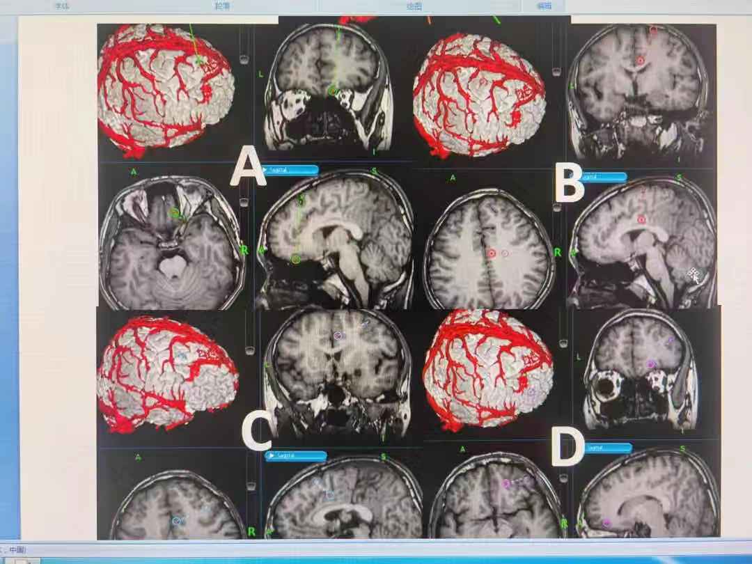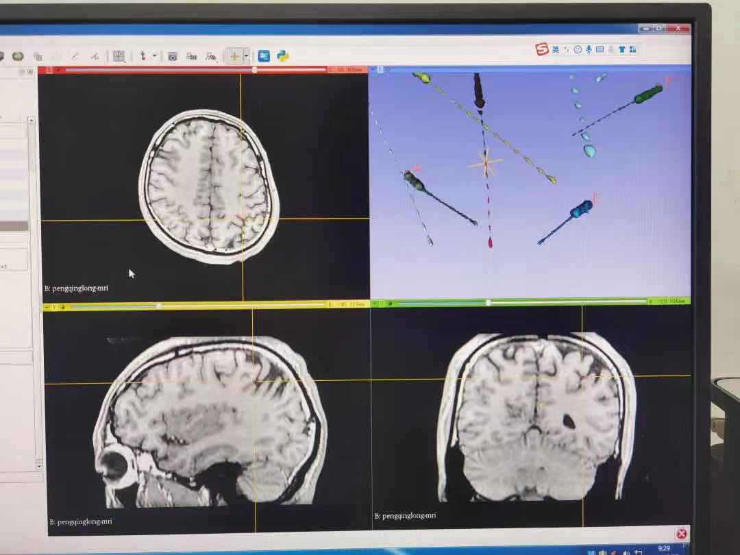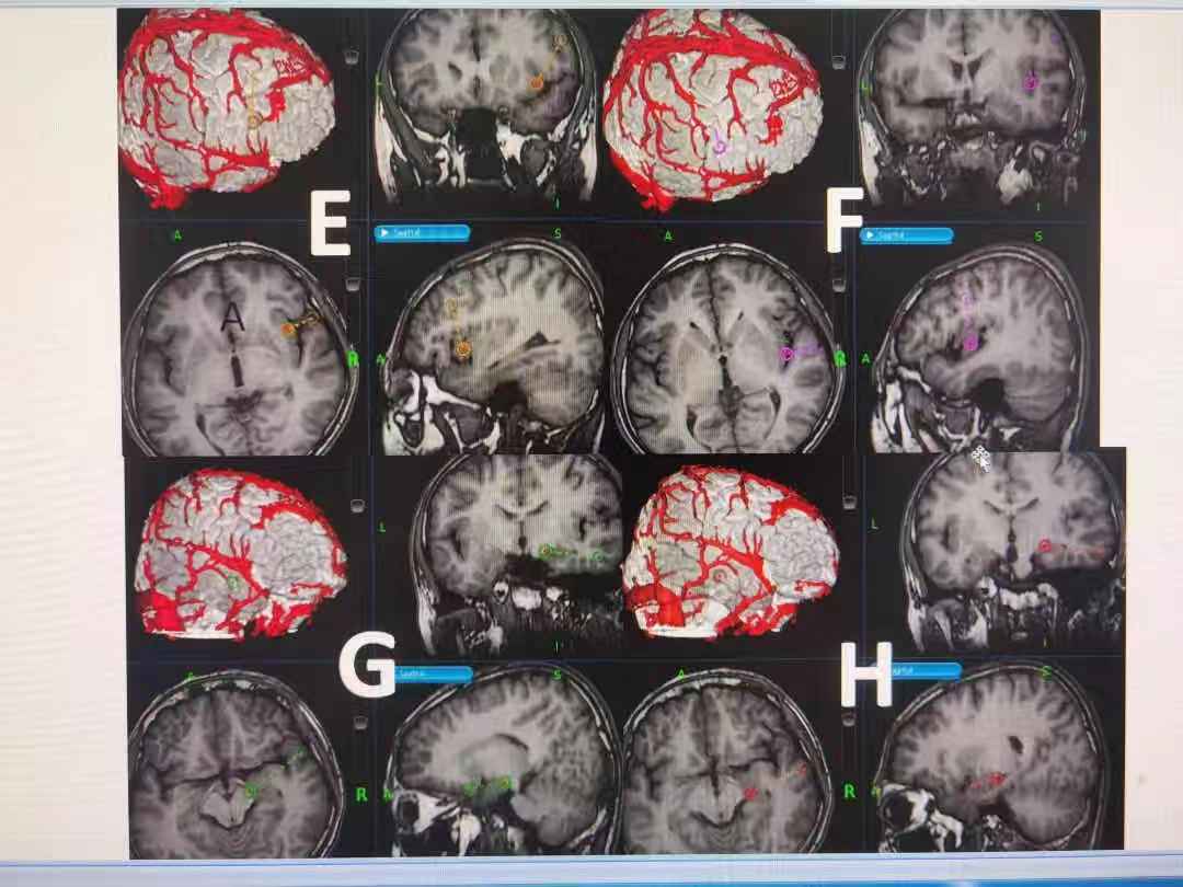 在经过全面的检查和详细了解孩子的病史后,专家决定为其进行SEEG检查。检查中,专家通过磁导航和术中脑电图引导,根据癫痫病灶的提示经皮精准插入9根电极针,通过这9根电极针对王鑫的癫痫病灶进行精准的3D定位,从而为毁损病灶提供更加精准的指引。