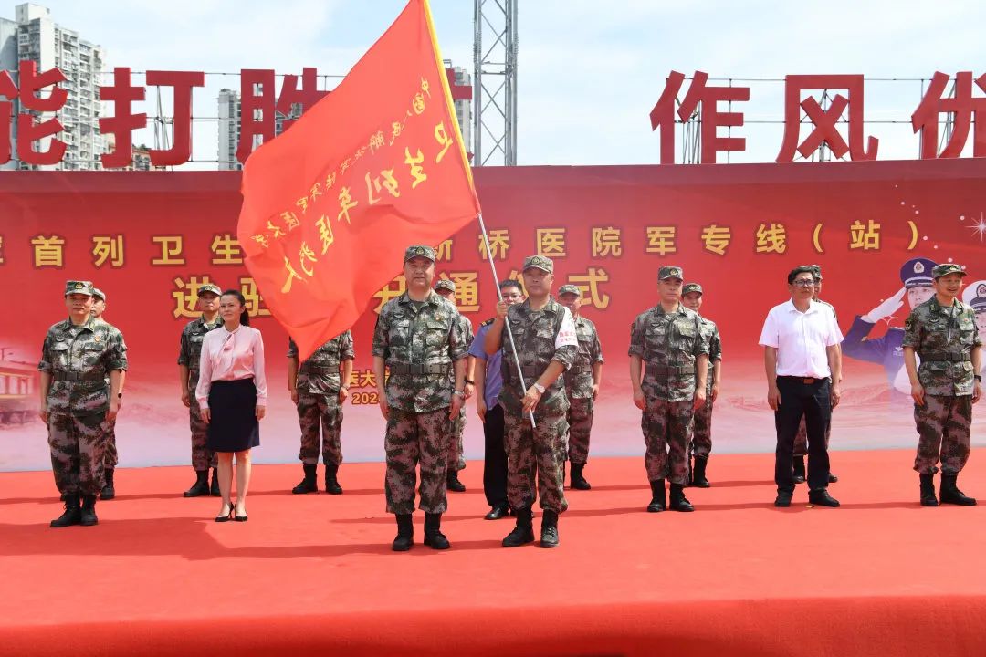 ▲陆军军医大学王生成校长为卫生列车医疗队授旗