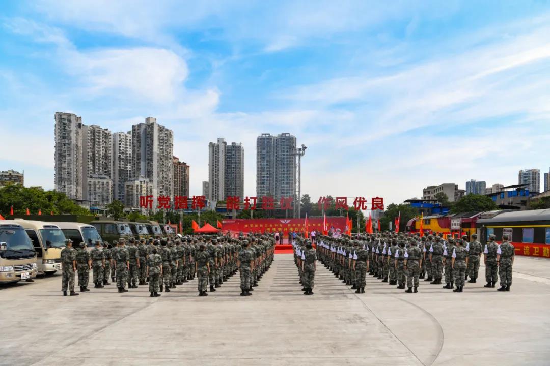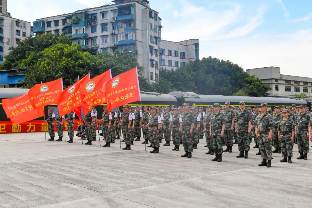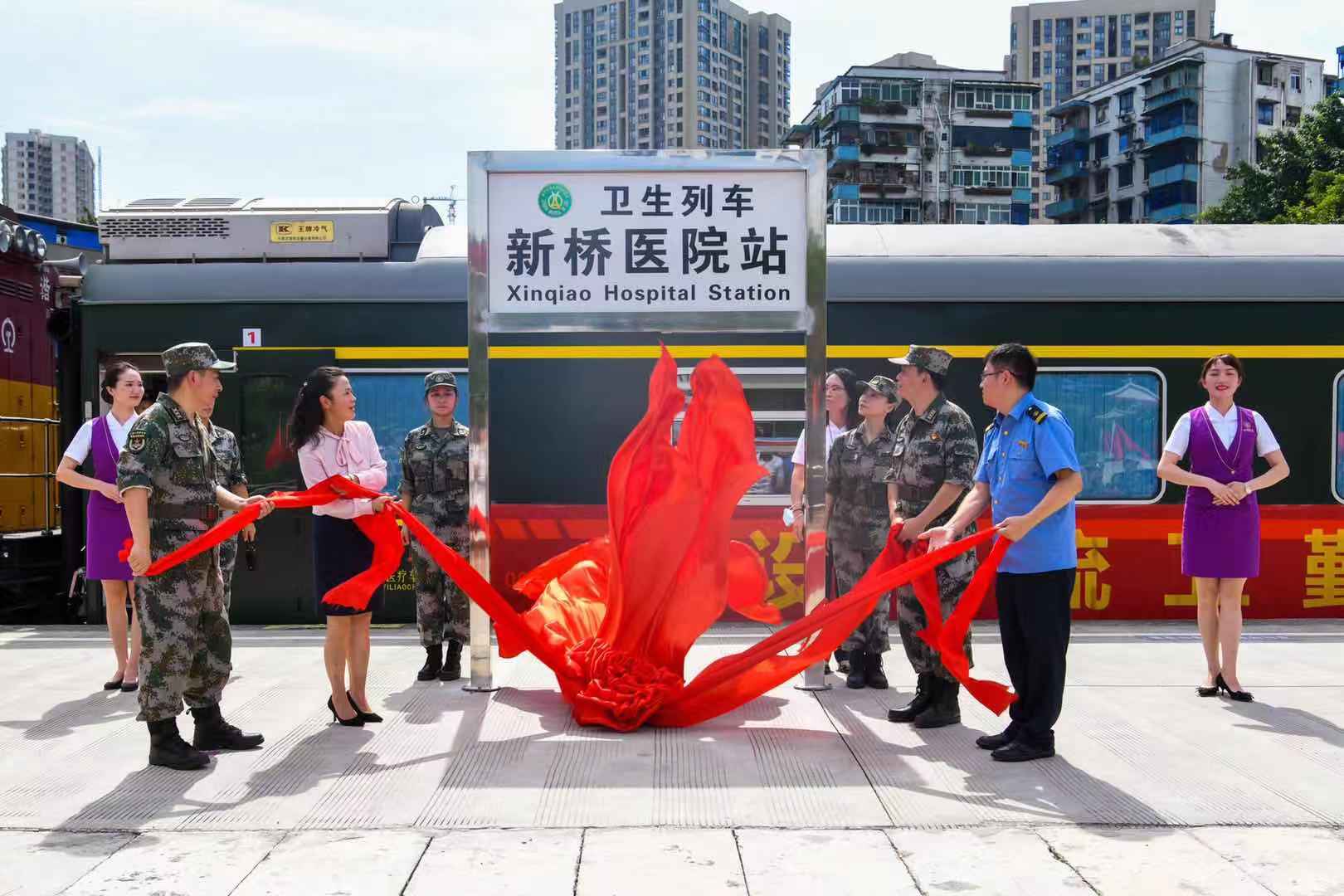▲重庆市沙坪坝区刘世莉副区长、陆军军医大学新桥医院唐万能政委、西部战区军事运输投送调度中心重庆军事代表室罗勇主任、中国铁路成都局集团有限公司重庆车站徐乾武副站长等领导为陆军军医大学“卫生列车新桥医院站”站牌揭幕