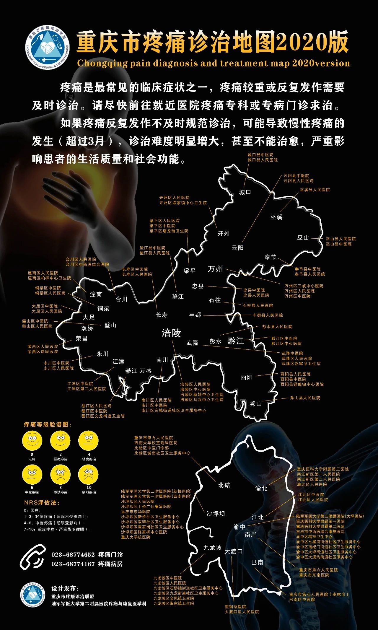 在首次发布的疼痛诊治地图上,按各区县地理位置标注了各地域疼痛诊治机构名单,并特别标识了疼痛等级脸谱图和疼痛的数字分级(NRS评估法),便于患者在就诊时对自己疼痛症状能有一个初步的评估。此后,该地图还将根据联盟成员单位的调整进行实时更新,给予患者就诊提供更科学准确的指引。