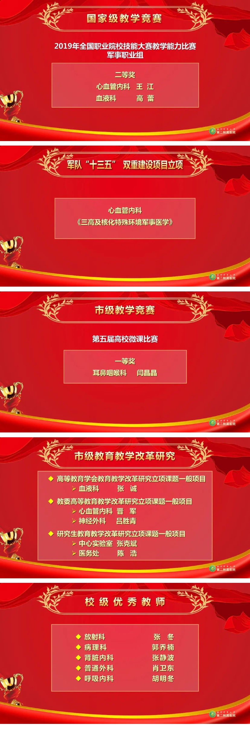 会上,院领导宣读了《2019至2020学年各级教学工作表彰通报》,向获表彰先进科室、先进集体和先进教师代表颁发了证书、奖杯和奖牌。