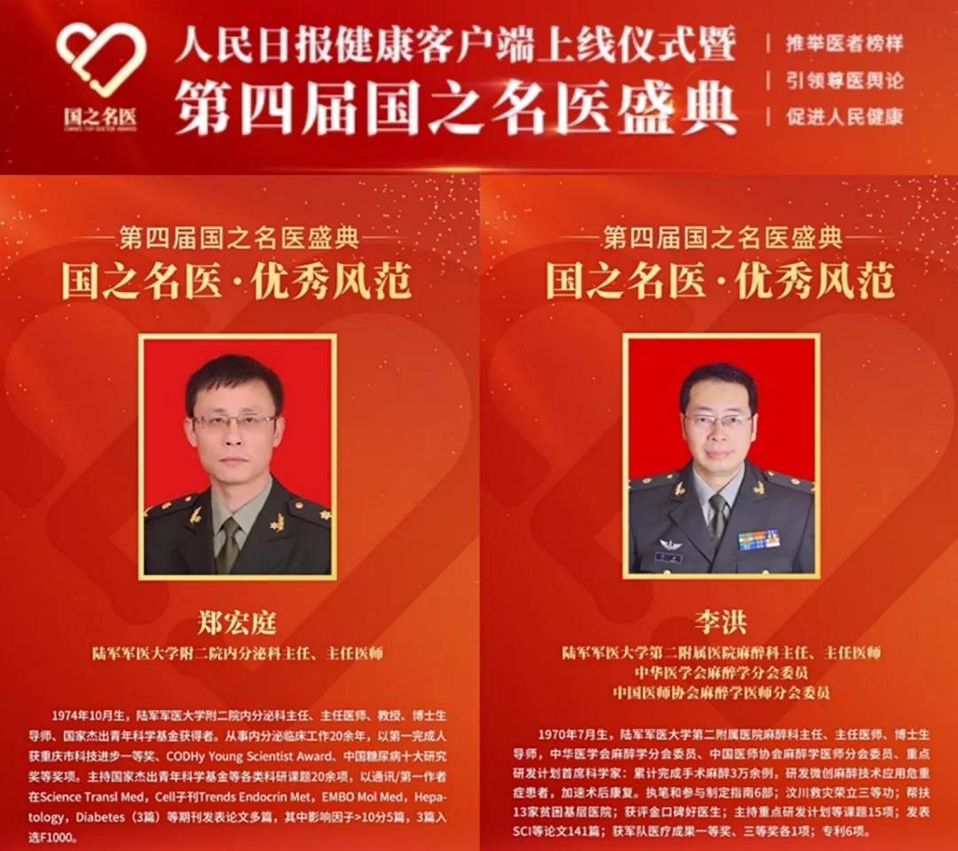 刚刚,在人民日报健康客户端、人民日报健康时报在线举行的第四届国之名医盛典上,陆军军医大学新桥医院内分泌科主任郑宏庭教授和麻醉科主任李洪教授双双荣获“国之名医·优秀风范”称号。