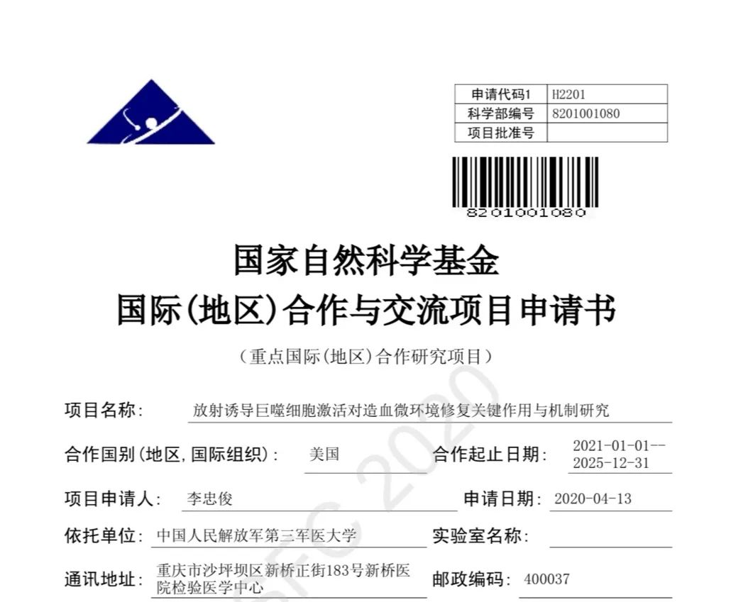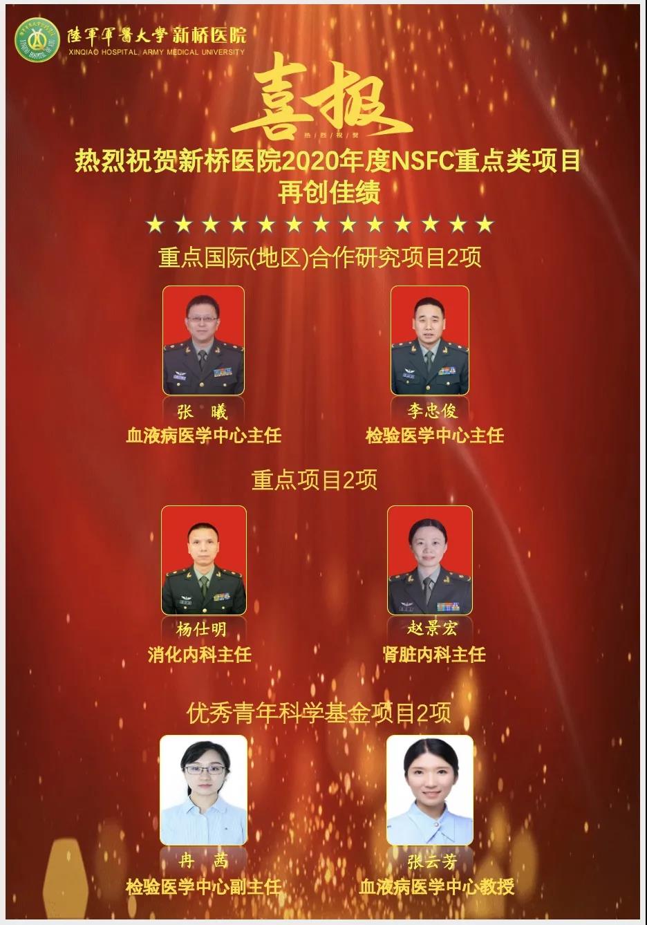 刚刚,在国家自然科学基金委员会通报的《2020年度基金申请项目评审结果通告》中,陆军军医大学新桥医院斩获2项重点项目,2项重点国际(地区)合作研究项目和2项优秀青年科学基金项目,6个项目合计获批资助经费1300余万元,单一年度在国家自然科学基金申报中获批高显示度项目数量和资助经费均创医院历史新高。