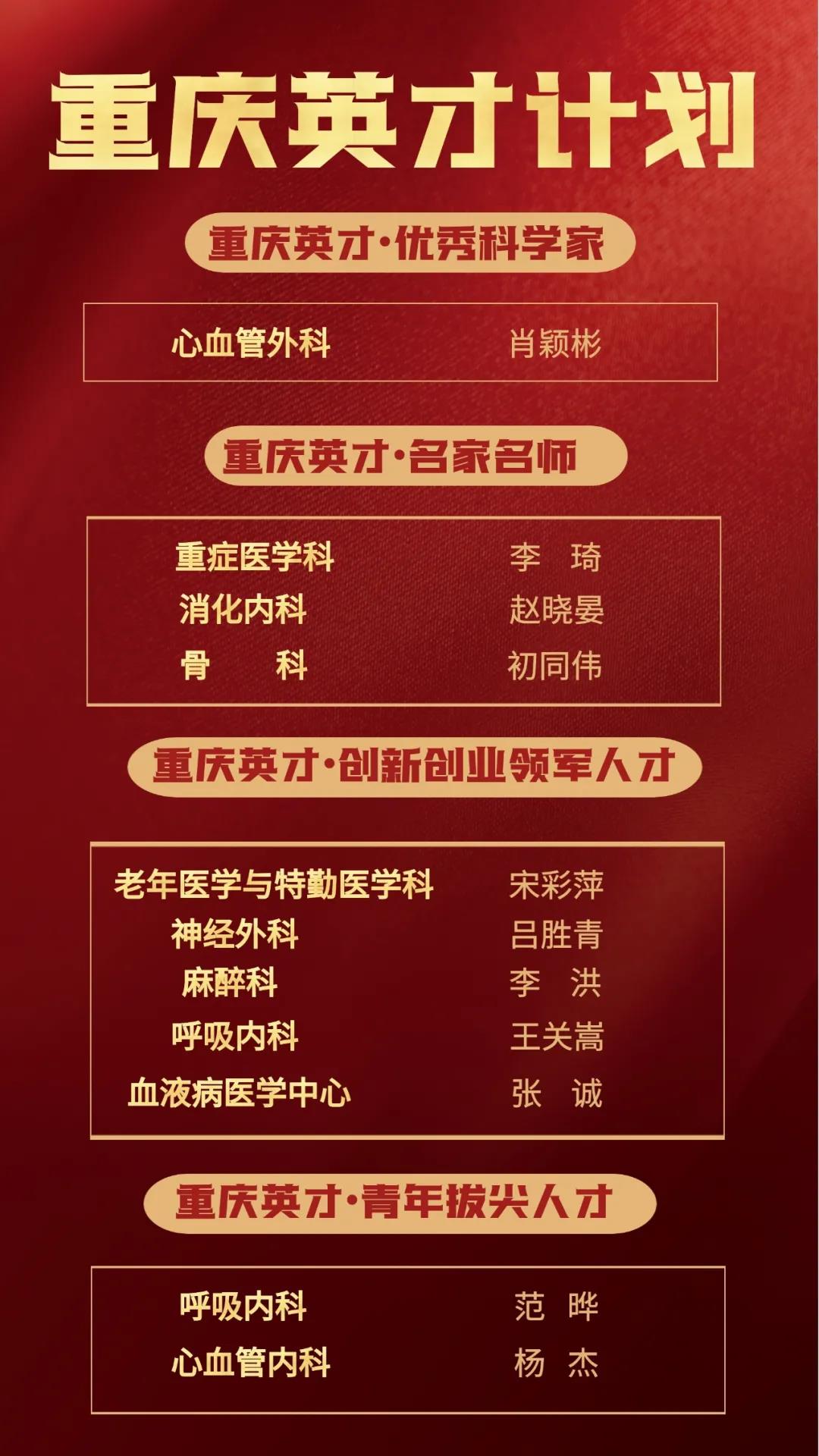 近日,中共重庆市委人才工作领导小组公布2020年重庆英才计划人选名单。陆军军医大学新桥医院共有11位专家入选。