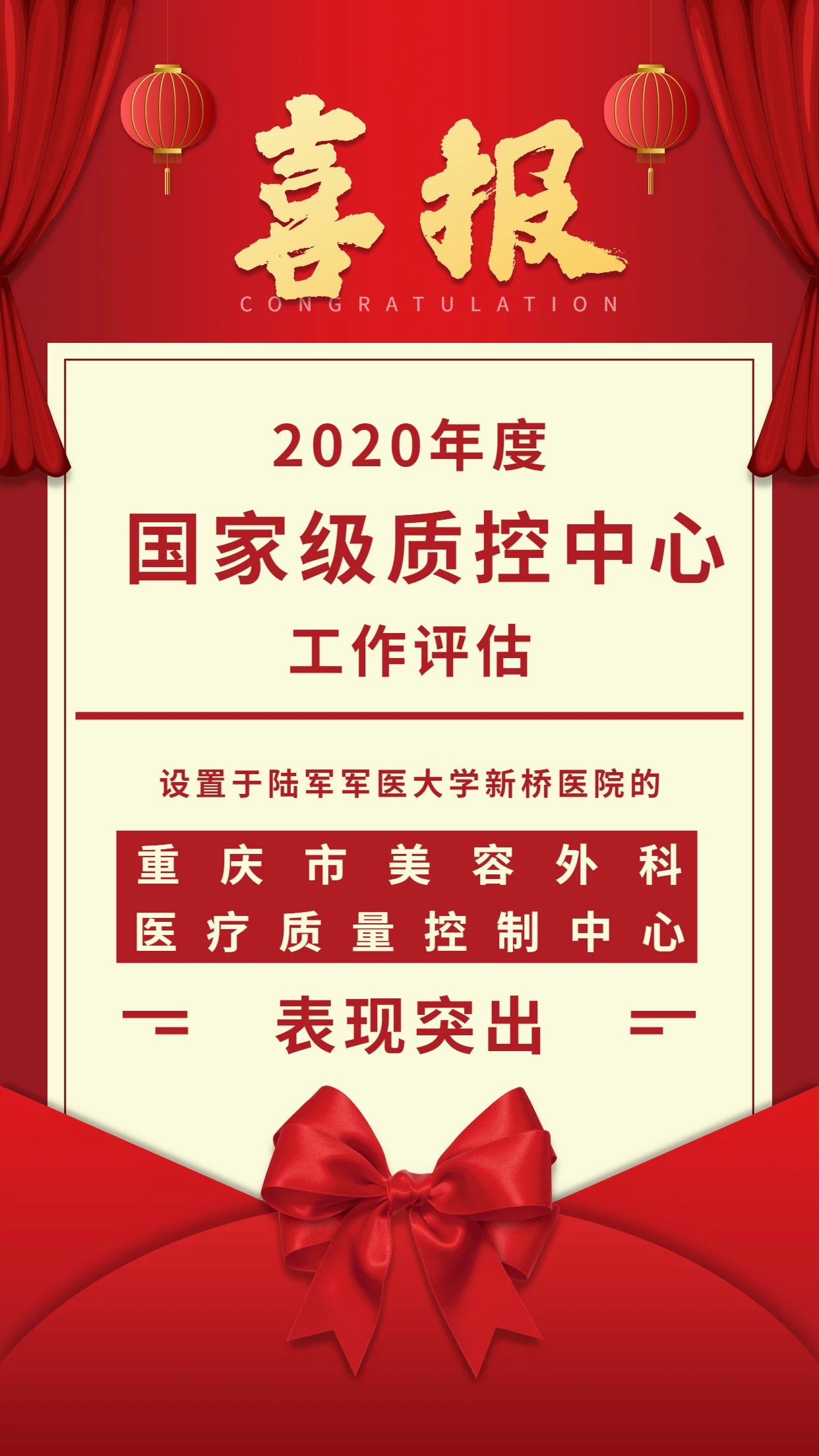 近日,国家卫生健康委医政医管局对2020年度国家级质控中心工作评估有关情况进行了通报。其中,设置于陆军军医大学新桥医院的重庆市美容外科医疗质量控制中心表现突出,受到通报表扬。