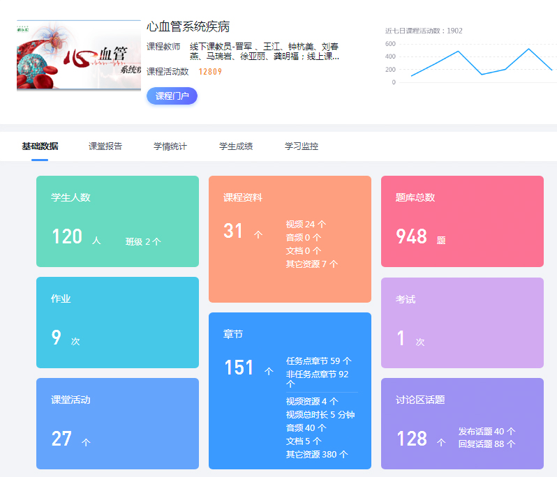 心血管系统疾病教学团队针对传统在线学习与课堂教学存在的不足,通过线上线下的方式充分与学生互动、沟通,将课程定位为“线上线下混合式”,包含:在线课程管理平台、教学管理系统、学生学习平台系统、学习行为轨迹记录系统、课堂互动管理系统、大数据分析系统。