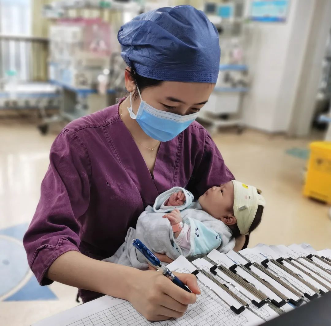 一个患新生儿肺炎的宝宝,因缺乏安全感和病体不适哭闹不止,责任护士便一边抱着宝宝安抚,一边继续书写护理记录。宝宝逐渐安静下来,还时不时凝视、打量着这位小阿姨。