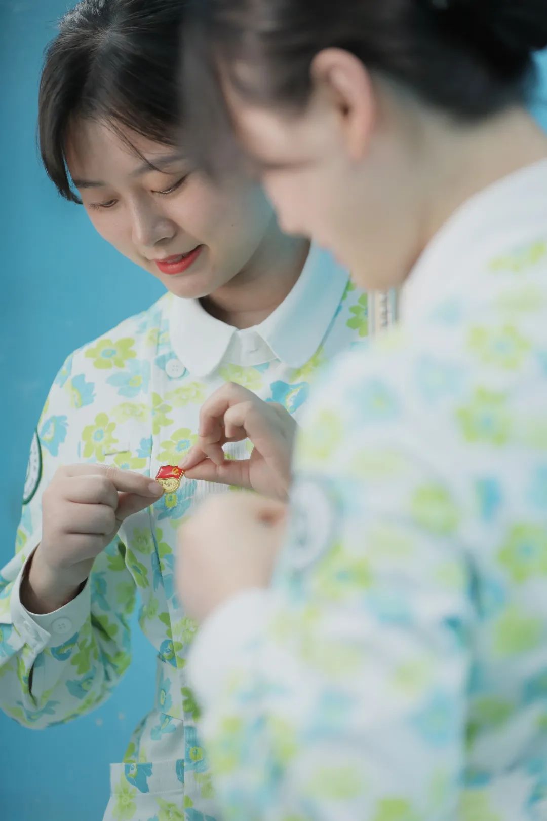 不忘党员身份,坚持佩戴党徽,为患者提供更优质的服务,是她做为一名共产党员的信念。