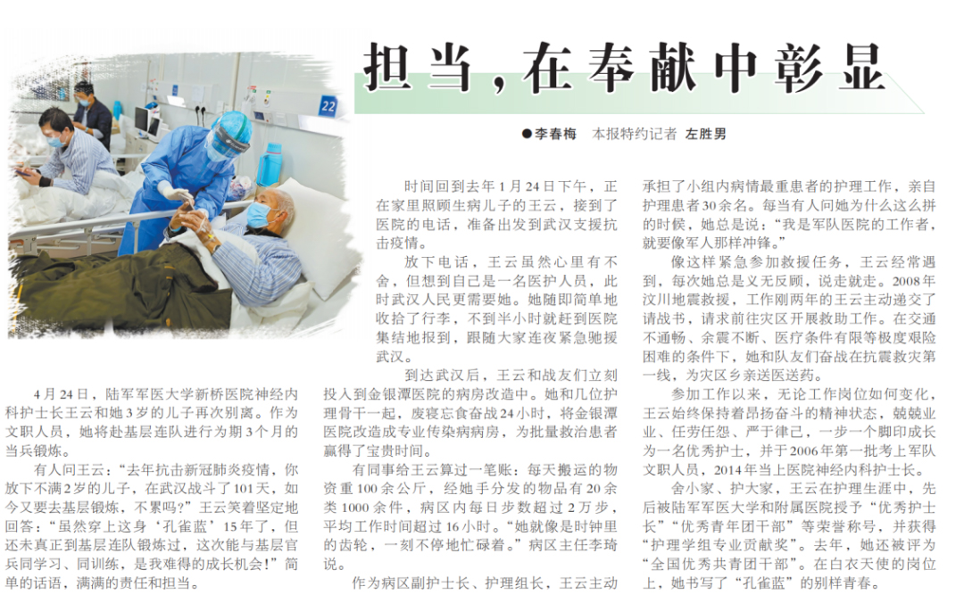 军队报纸刊载神经内科王云护士长人物事迹《担当,在奉献中彰显》。