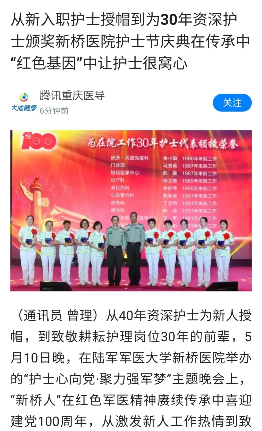 5月10日晚,在新桥医院举办的“护士心向党·聚力强军梦”主题晚会上,还专门举行了为新入职护士授帽和致敬耕耘一线护理岗位30年前辈环节,“新桥人”在红色军医精神赓续传承中喜迎建党100周年。系列活动旨在传承和弘扬南丁格尔精神,呼唤埋藏在人们心底的信仰,勇担伟大的初心使命。也将激励更多“新桥人”扎根各自岗位,在强军兴军的征程上、在为民服务的岗位上做出更多新贡献。