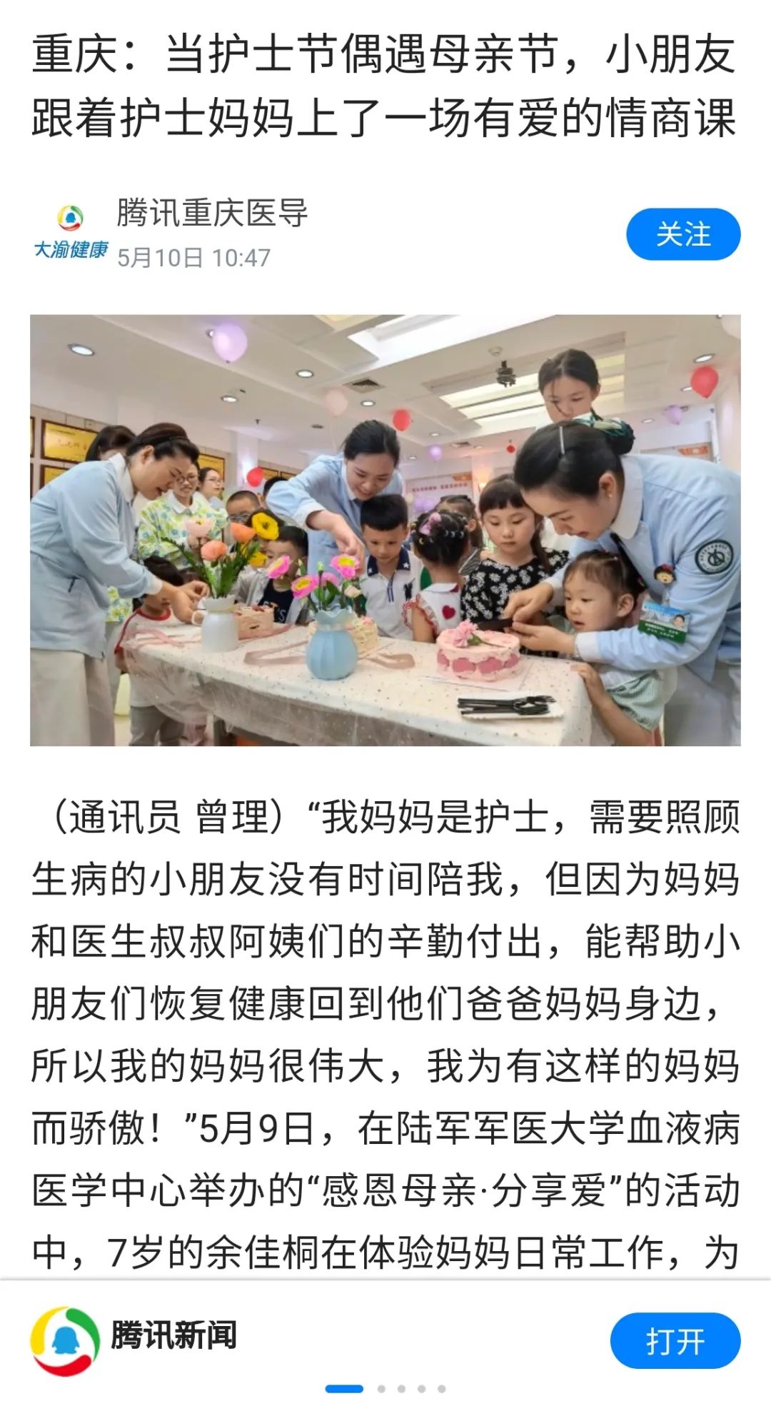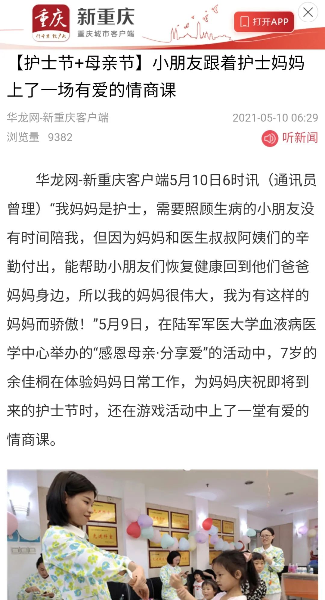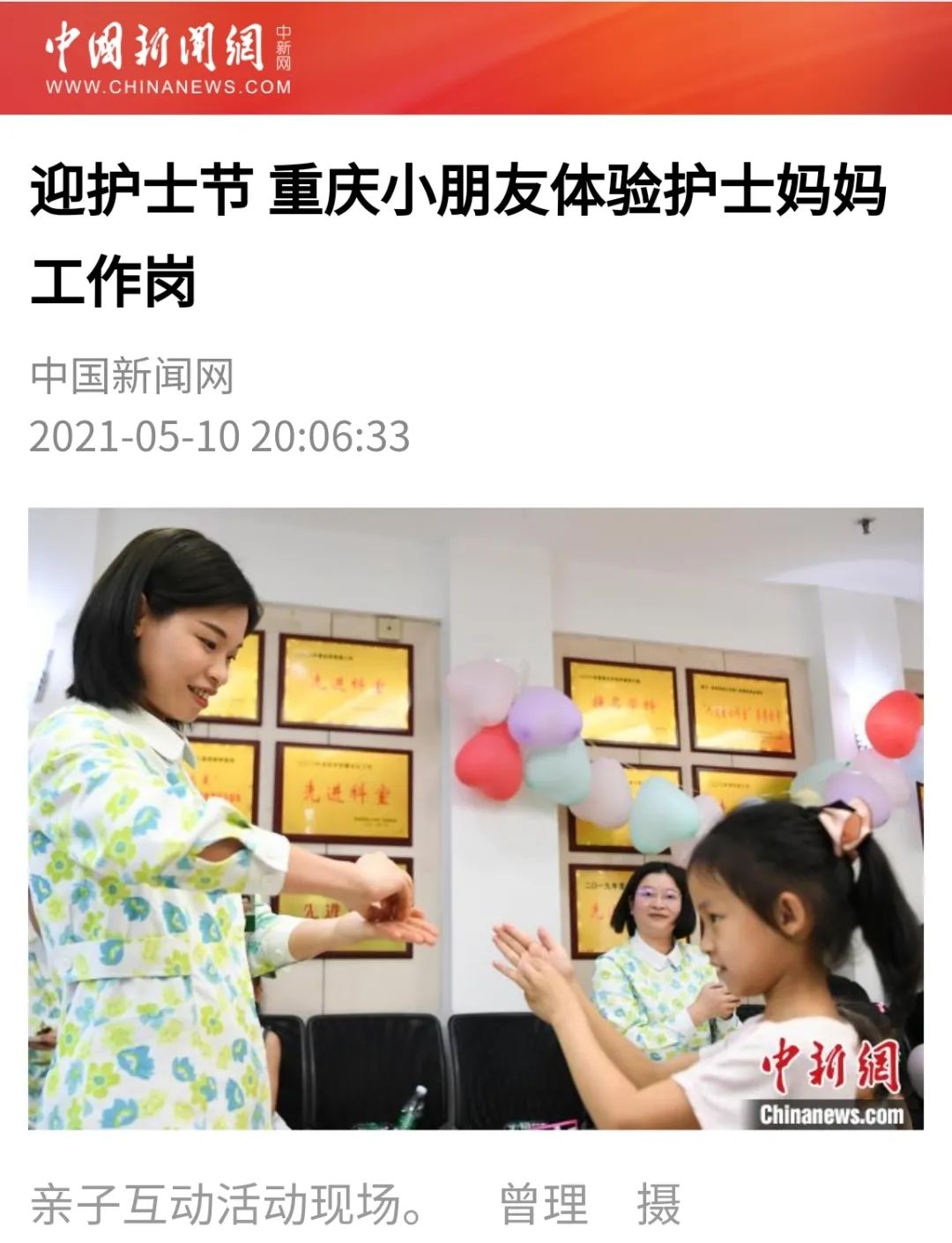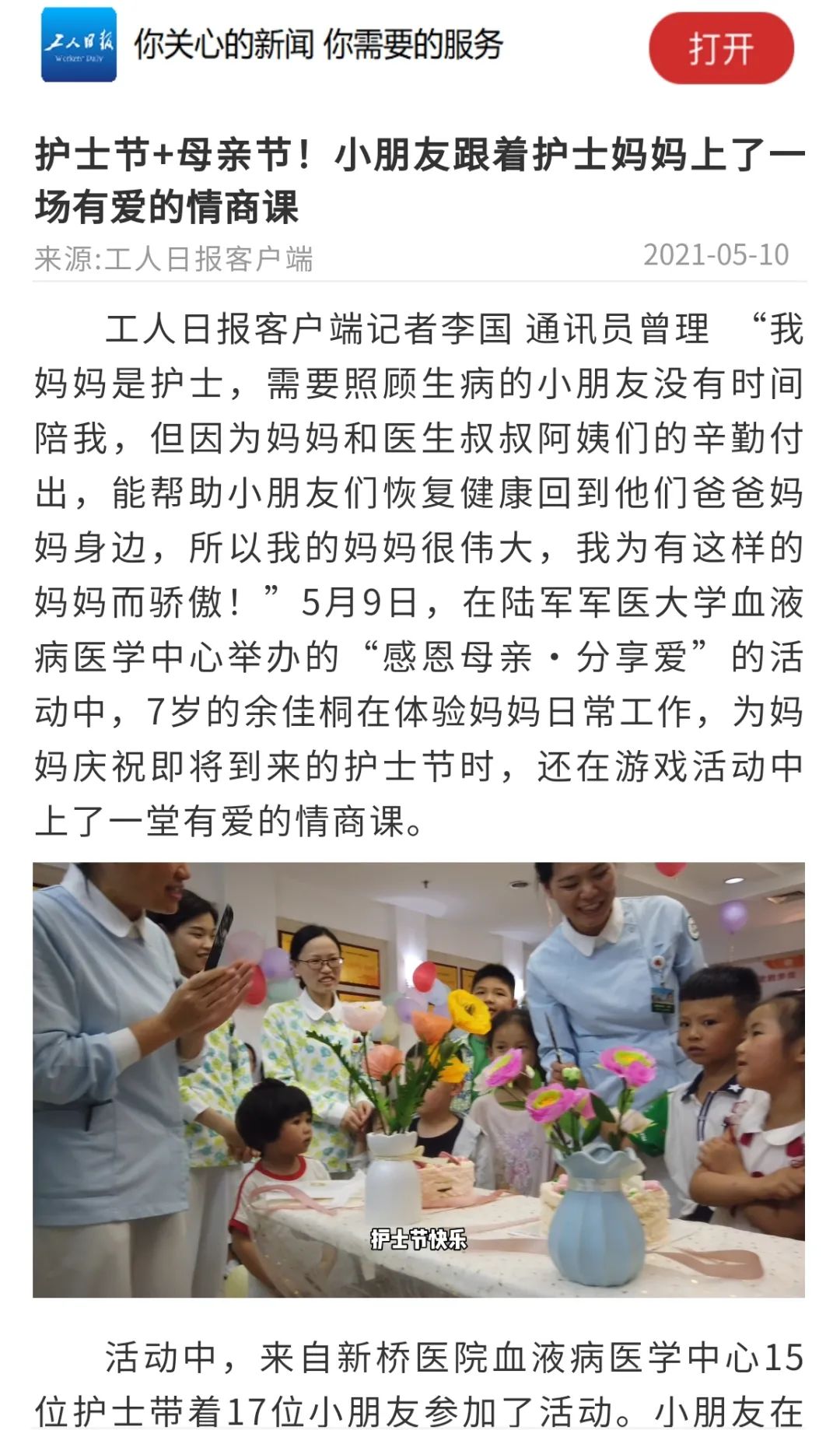 此外,医院荣获“全国人文爱心科室”的血液病医学中心,特别在护士节到来之际举办“感恩母亲·分享爱”活动,组织护士的孩子前往妈妈工作的岗位亲身感受护士工作的辛苦。一边让孩子们参加社会体验和社会实践的同时,一边让孩子们上了一堂有爱的情商课。该活动也通过新华社、中新网、《工人日报》、《重庆晨报》头版等媒体广泛报道,进一步拓展了医院护理品牌。