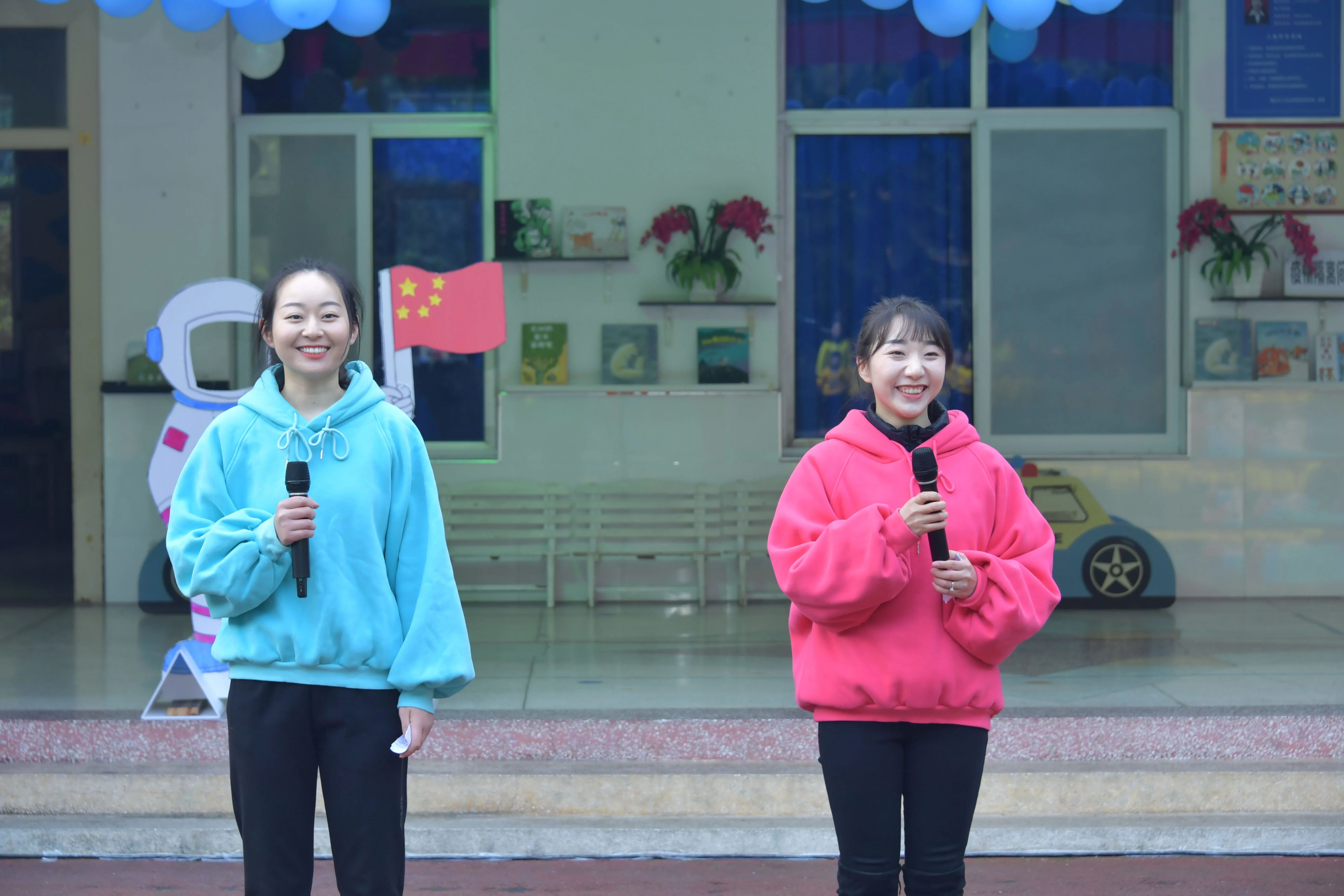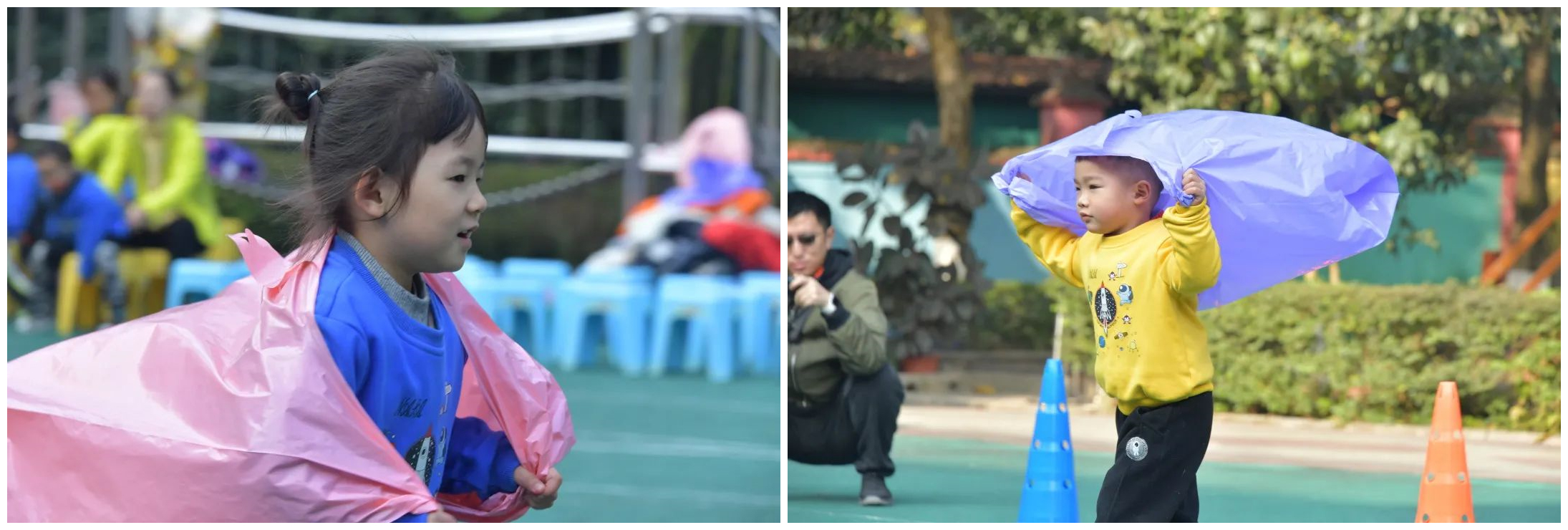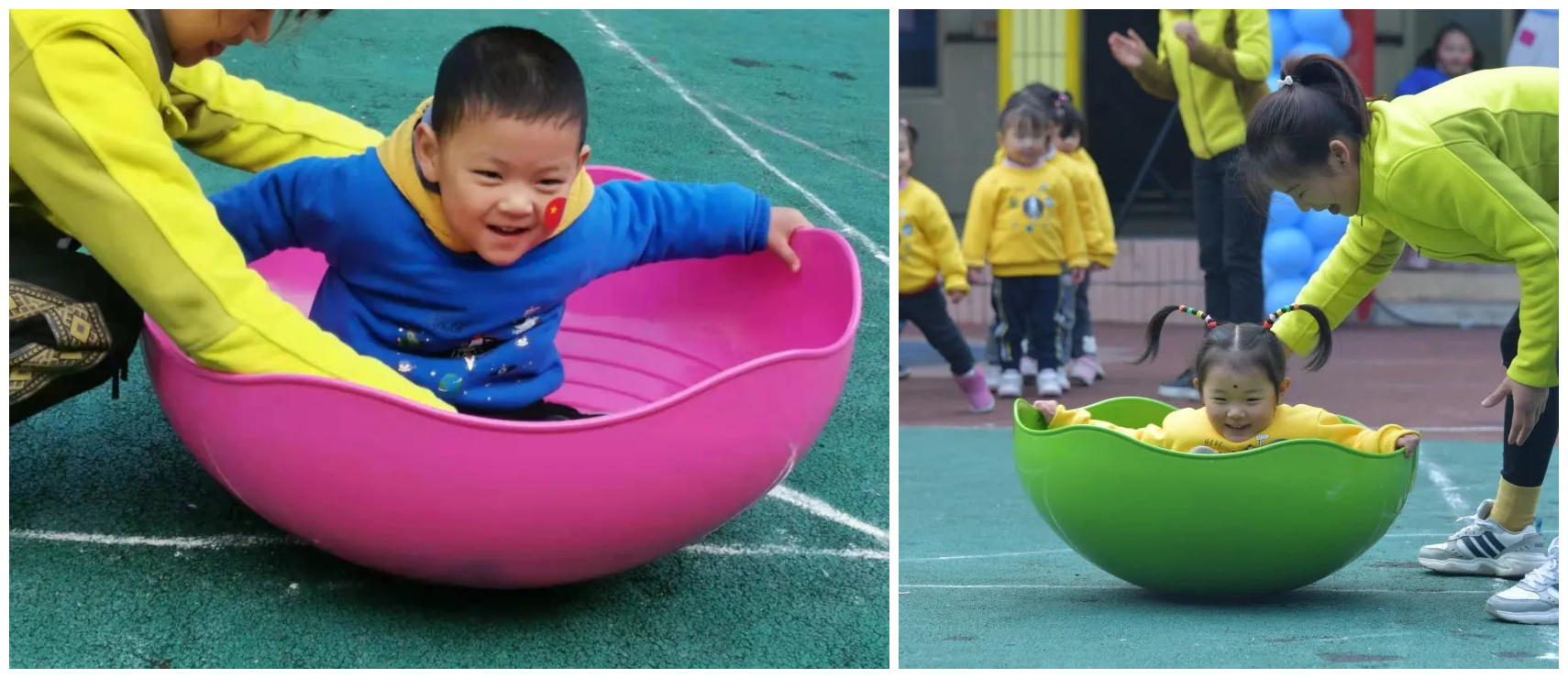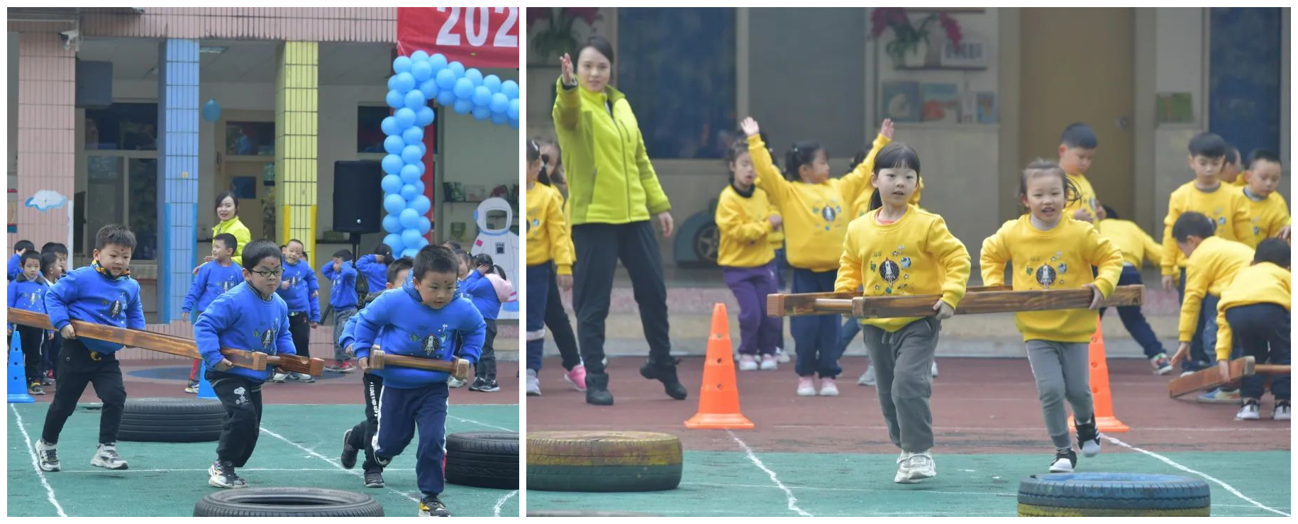 旋转飞船 比赛项目:旋转飞船 参赛人员:小三班和小二班 比赛规则:操场上出现了四个旋转陀螺,小宇航员们分为4组,依次坐在旋转陀螺转2圈后,跑向前方敲鼓再返回原点。小宇航员旋转完后尽量保持平衡,不要跌倒。  紧急降落 比赛项目:紧急降落 参赛人员:小一班和中三班 比赛规则:小小宇航员背着“降落伞”往返接力跑,当“降落伞”里装满空气,宇航员们将负“重”前行,紧急降落返回,率先返回的队获胜。