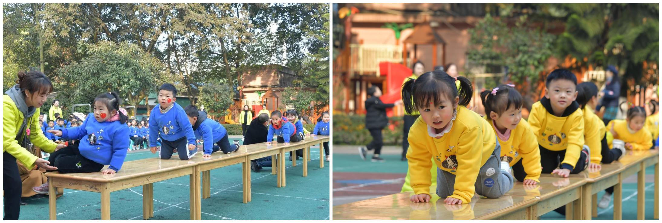 天宫号方队:大二班、大一班 这是一个团结友爱、积极向上的集体 他们个个喜笑颜开,生龙活虎 迈着有力的步伐步入运动场 他们的口号是:天宫天宫,圆梦太空! 正式开始  幼儿园周永园长给孩子们 送上美好的新年祝福 带领小宇航员们一起宣誓: “为了健康的体魄而运动”!  两位年轻又有活力的老师 带领大家集体跳“加油amigo”啦啦操 孩子们热身结束 主持人宣布运动会比赛正式开始 穿越时空 比赛项目:穿越时空 参赛人员:小三班和小二班 比赛规则:在老师们的帮助下,操场上出现了两条长长的时空隧道,两个班的小宇航员分别从两组出发,一组先从桌底依次爬过隧道,再爬上桌面,另一组循环进行,比较宝贝们的速度和胆量。