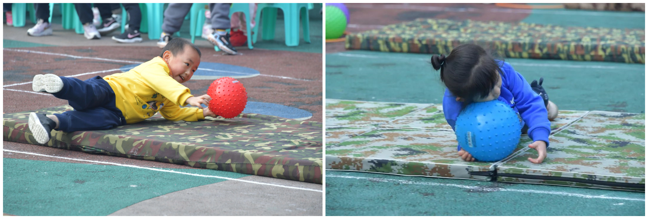 翻滚星球 比赛项目:翻滚星球 参赛人员:小一班和中三班 比赛规则:操场上出现了八大行星,两个班的小宇航员们分为8个组比赛,将圆圈里的两颗星球,每次抱一颗在胸前,在垫子上翻滚运送到星球的另一端,他们比的是平衡和速度。