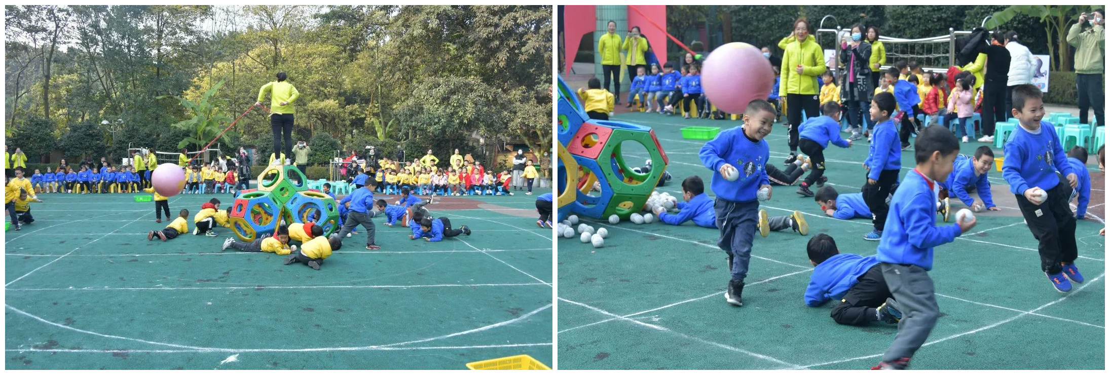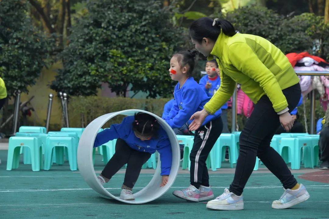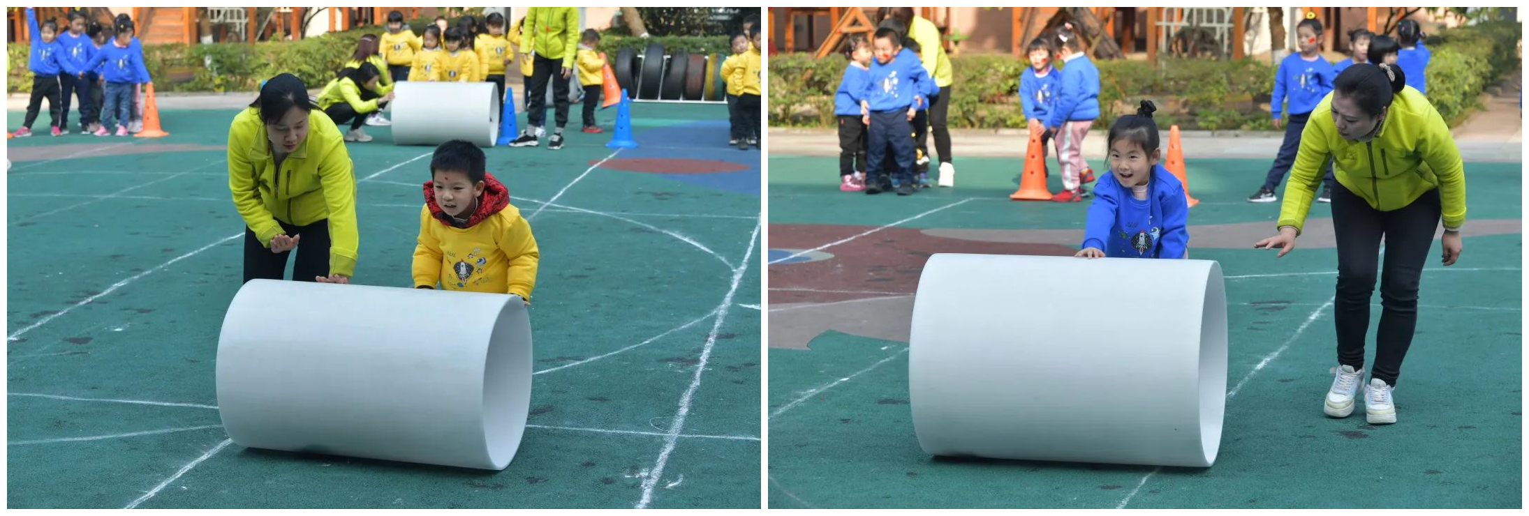 斗转星移 比赛项目:斗转星移 参赛人员:中一班和中二班 比赛规则:操场上现在出现了四个圆圆的大滚筒,宇航员们将两人一组,一名幼儿蜷缩在滚筒里用手脚撑住滚筒内壁,另一名幼儿推动滚筒从起点出发,到达场地另一端后两名幼儿交换位置,再把滚筒推回起点交给下一组幼儿。