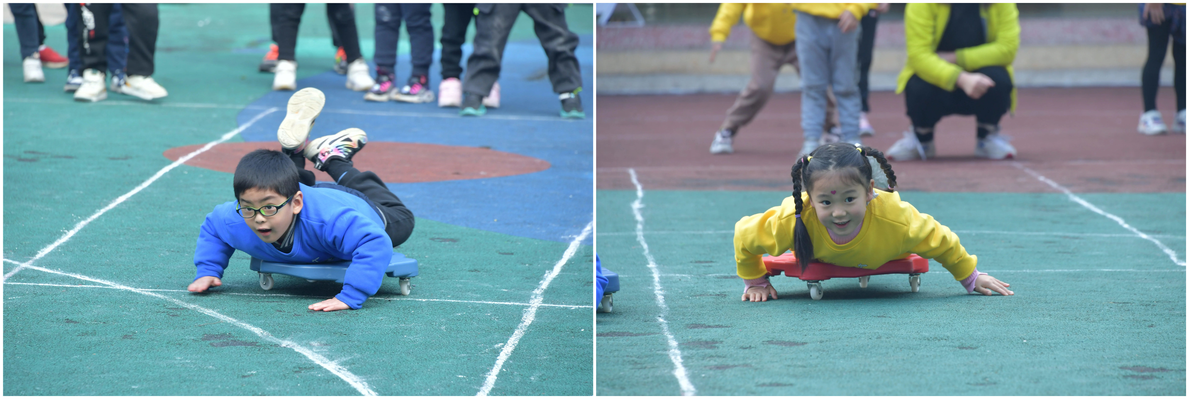 天旋地转 比赛项目:天旋地转 参赛人员:大一班和大二班 比赛规则:两个班分为8组进行迎面接力比赛,幼儿肚贴平衡滑板双脚弯曲,双手用力将身体旋转5圈后,起身跑步至终点拍手接力下一个幼儿,他们比的是平衡能力和手脚协调能力。
